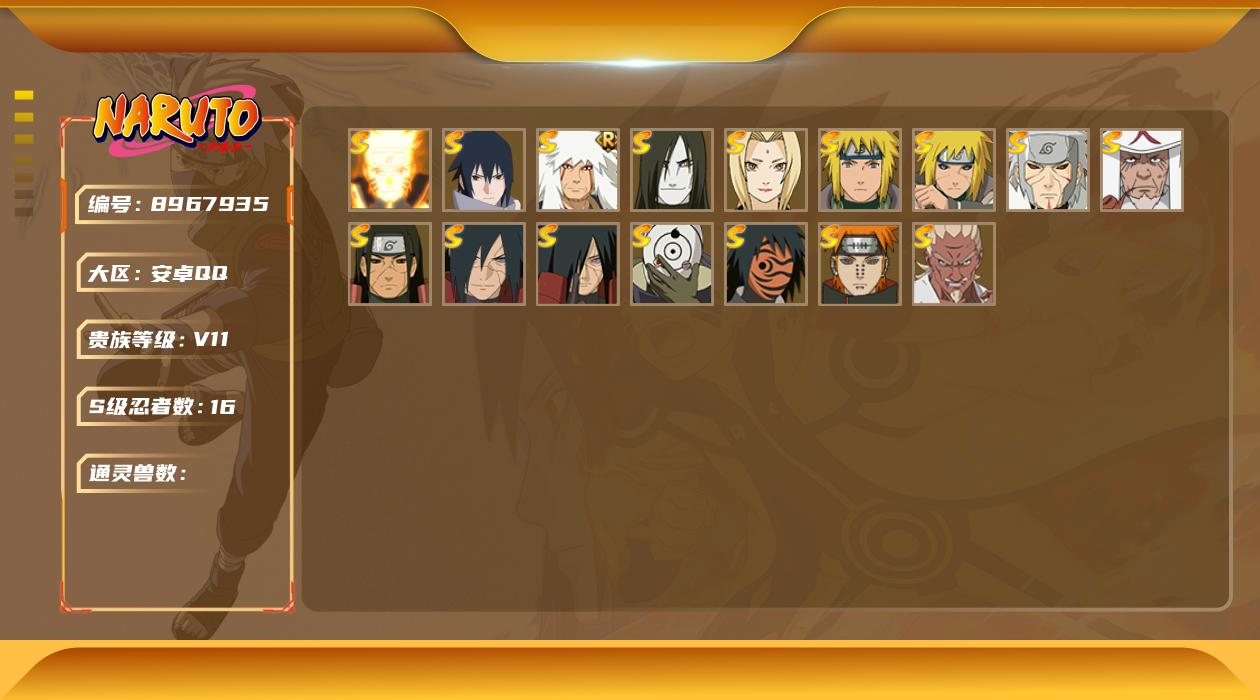[8967935]v11 16s 可二次 s级忍者:艾「忍界大战」宇智波斑「秽土转生·解」宇智波佐助「永恒万花筒」神秘面具男 「红夜之刃」漩涡鸣人 「九喇嘛连结」千手柱间「秽土转生」自来也 「舞之豪杰」宇智波斑「秽土转生」“宇智波斑” 「白面具」千手扉间「秽土转生」波风水门「秽土转生」佩恩「天道」猿飞日斩波风水门大蛇丸纲手