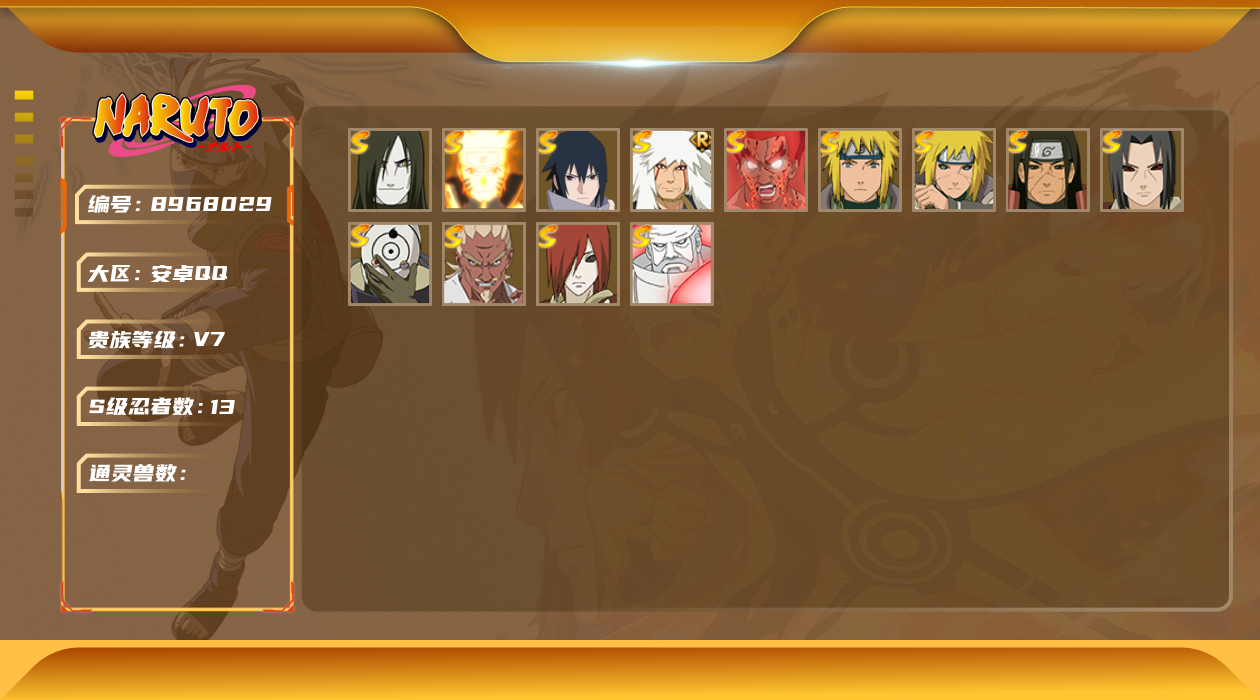 v10 33s 可二次 s级忍者:艾「忍界大战」宇智波斑「秽土转生·解」宇智波佐助「永恒万花筒」春野樱 「忍界大战」漩涡鸣人 「九喇嘛连结」宇智波带土 「忍界大战」千手柱间「秽土转生」自来也 「舞之豪杰」宇智波鼬「秽土转生」药师兜「仙人模式」宇智波斑「秽土转生」“宇智波斑” 「