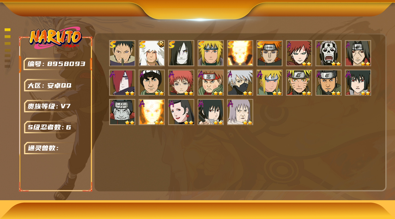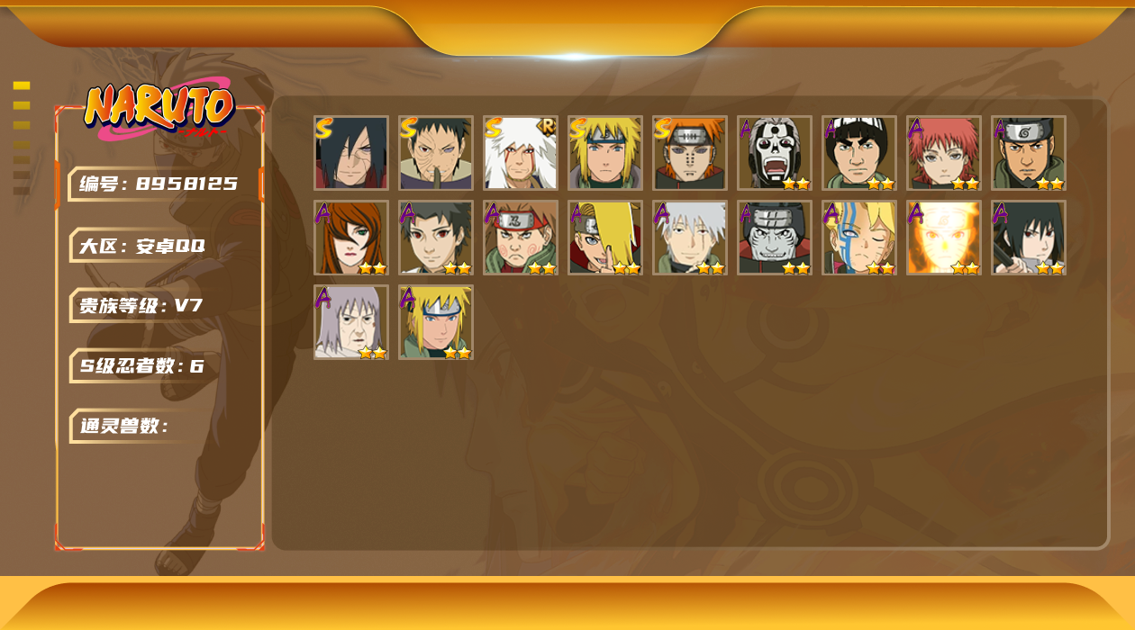 [8958125]xr38145-安卓q-可修改-区服3144-6s级忍者数-17a级忍者数 【s级忍者】:宇智波斑「秽土转生·解」3星,宇智波带土「忍界大战」3星,自来也「舞之豪杰」3星,波风水门3星,佩恩「天道」3星,宇智波斑 「白面具」3星宇智波斑「白面具」 【a级忍者】:波风水门「青年」2星,迪达拉2星,飞段「死司凭血」2星,干柿鬼鲛2星,漩涡博人「桃式显现」2星,漩涡鸣人「九尾查克拉」2星,迈特凯2星,旗木卡卡西「幻之真容」2星,蝎2星,猿飞阿斯玛2星,宇智波止水「新春限定」2星,宇智波佐助「须佐能乎」2星,照美冥「五代目水影」2星,黑土「博人传」2星,秋道丁次「忍界大战」2星,千代「近松十人卫」2星,宇智波泉奈2星
