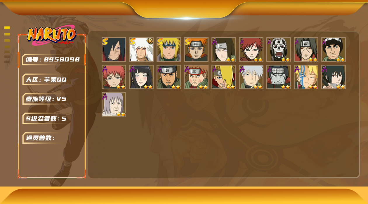 [8958098]xr38242-苹果qq-可修改-5s级忍者数-17a级忍者数 【s级忍者】:宇智波斑「秽土转生·解」3星,自来也「舞之豪杰」3星,波风水门3星,佩恩「天道」3星,宇智波斑 「白面具」3星宇智波斑「白面具」 【a级忍者】:迪达拉2星,飞段「死司凭血」2星,干柿鬼鲛2星,漩涡博人「桃式显现」2星,迈特凯2星,旗木卡卡西「幻之真容」2星,我爱罗「疾风传」2星,蝎2星,蝎「绯流琥」2星,猿飞阿斯玛2星,宇智波鼬2星,宇智波佐助「须佐能乎」2星,日向宁次「忍界大战」2星,日向雏田「最终章」2星,秋道丁次「忍界大战」2星,千代「近松十人卫」2星,宇智波泉奈2星