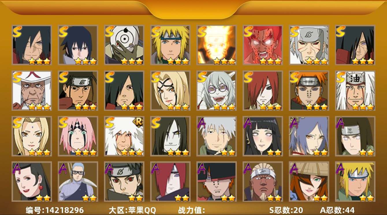 [14462396]v11 24s忍 35a忍 21通灵 1162.8w战力 可二次 可修改实名 【s级忍者】:千手柱间·木叶创立宇智波佐助「永恒万花筒」神秘面具男 「红夜之刃」宇智波带土 「忍界大战」千手柱间「秽土转生」自来也 「舞之豪杰」宇智波鼬「秽土转生」药师兜「仙人模式」宇