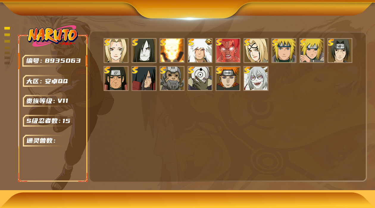 [8935304]10s 实名: 可修改 贵族等级: v9 s级忍者: 千手柱间「秽土转生」宇智波鼬「秽土转生」佩恩「天道」大蛇丸波风水门迈特凯「死门」自来也 「舞之豪杰」漩涡鸣人 「九喇嘛连结」春野樱 「忍界大战」宇智波斑「秽土转生·解」