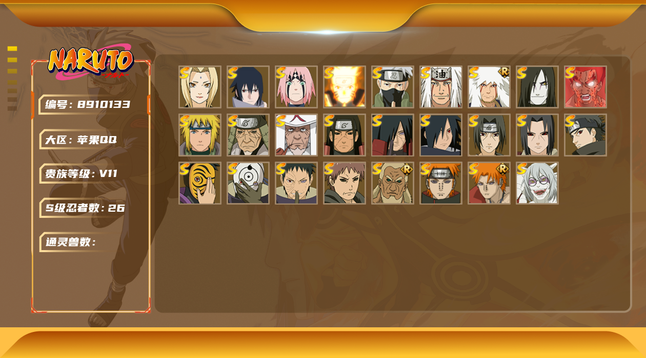 [8910133]v11 26s 可二次 s级忍者:宇智波止水「须佐能乎」宇智波佐助「永恒万花筒」春野樱 「忍界大战」漩涡鸣人 「九喇嘛连结」迈特凯「死门」宇智波斑 「木叶创立」宇智波带土 「忍界大战」千手柱间「秽土转生」罗砂「四代目风影」自来也 「舞之豪杰」旗木卡卡西「须佐能乎」宇智波鼬「秽土转生」佩恩·天道「超」药师兜「仙人模式」宇智波斑「秽土转生」艾「三代目雷影」“宇智波斑” 「白面具」猿飞日斩「秽土转生」神秘面具男宇智波鼬 「须佐能乎」佩恩「天道」猿飞日斩波风水门大蛇丸自来也纲手