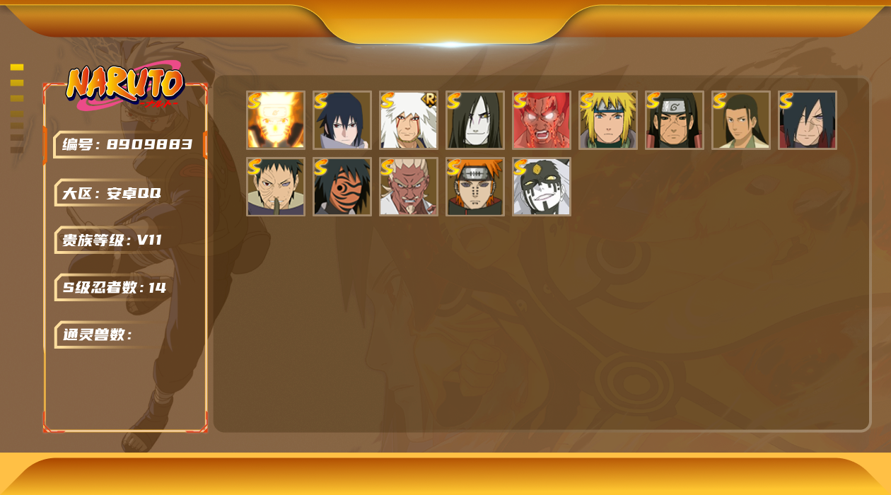 [8909883]v11 14s 可二次 s级忍者:艾「忍界大战」大筒木桃式宇智波斑「秽土转生·解」千手柱间·木叶创立宇智波佐助「永恒万花筒」神秘面具男 「红夜之刃」漩涡鸣人 「九喇嘛连结」迈特凯「死门」宇智波带土 「忍界大战」千手柱间「秽土转生」自来也 「舞之豪杰」佩恩「天道」波风水门大蛇丸