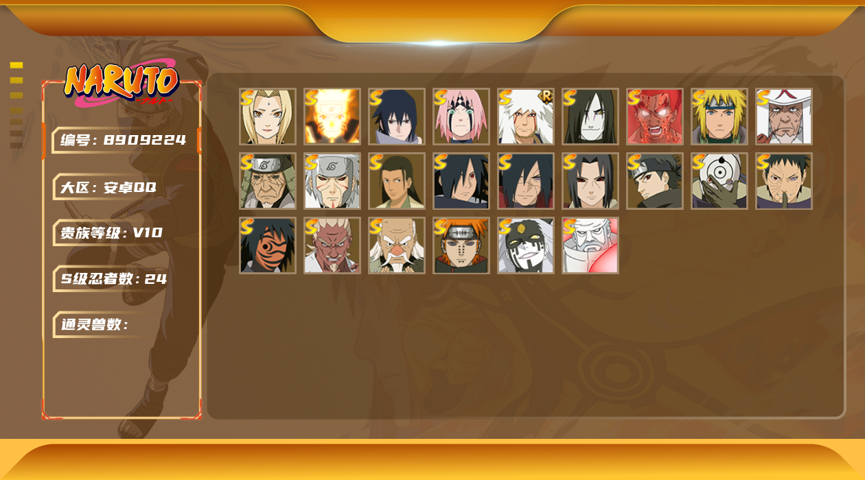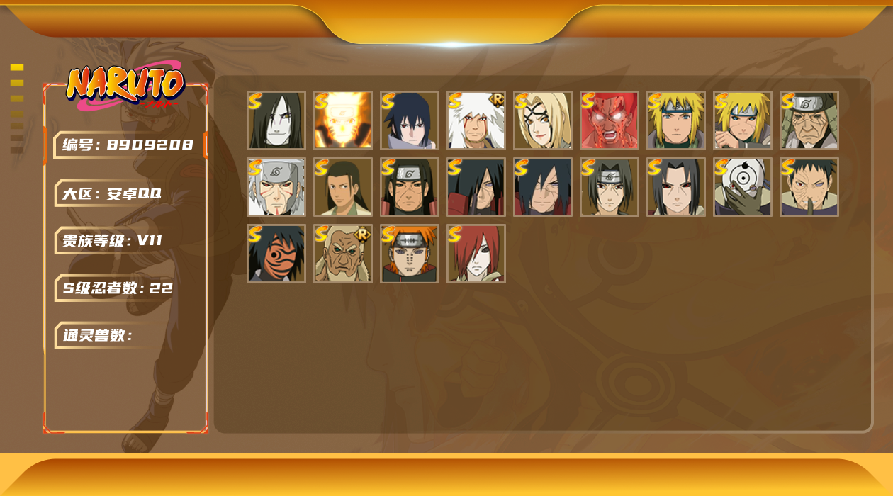 [8909208]v11 22s 可二次 s级忍者:宇智波斑「秽土转生·解」千手柱间·木叶创立宇智波佐助「永恒万花筒」神秘面具男 「红夜之刃」漩涡鸣人 「九喇嘛连结」迈特凯「死门」宇智波带土 「忍界大战」千手柱间「秽土转生」自来也 「舞之豪杰」宇智波鼬「秽土转生」宇智波斑「秽土转生」艾「三代目雷影」“宇智波斑” 「白面具」千手扉间「秽土转生」纲手「百豪」波风水门「秽土转生」猿飞日斩「秽土转生」长门「秽土转生」宇智波鼬 「须佐能乎」佩恩「天道」波风水门大蛇丸