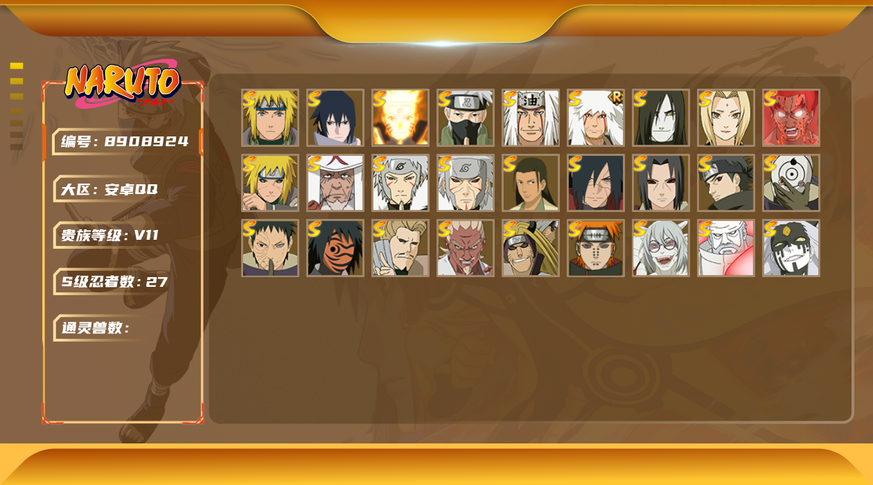 v11 27s 可二次 可修改实名 s级忍者:宇智波止水「须佐能乎」艾「忍界大战」大筒木桃式宇智波斑「秽土转生·解」千手柱间·木叶创立宇智波佐助「永恒万花筒」神秘面具男 「红夜之刃」大筒木金式「博人传」漩涡鸣人 「九喇嘛连结」迈特凯「死门」宇智波带土 「忍界大战」自来也 「舞之