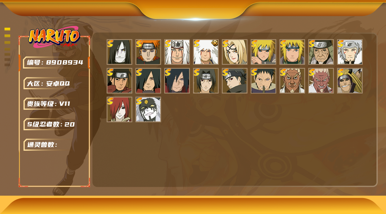 v11 20s 可二次 s级忍者:宇智波止水「须佐能乎」艾「忍界大战」大筒木桃式宇智波斑「秽土转生·解」宇智波带土 「忍界大战」自来也 「舞之豪杰」纲手「百豪」波风水门「秽土转生」金角/银角「秽土转生」猿飞日斩「秽土转生」长门「秽土转生」宇智波斑千手柱间艾「四代目雷影」千