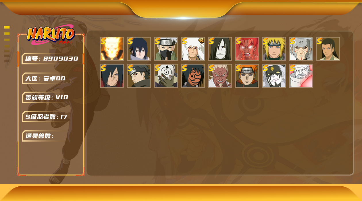 [8909030]v10 17s 可二次 s级忍者:宇智波止水「须佐能乎」艾「忍界大战」大筒木桃式宇智波斑「秽土转生·解」千手柱间·木叶创立宇智波佐助「永恒万花筒」神秘面具男 「红夜之刃」大筒木金式「博人传」漩涡鸣人 「九喇嘛连结」迈特凯「死门」自来也 「舞之豪杰」旗木卡卡西「须佐能乎」“宇智波斑” 「白面具」千手扉间「秽土转生」佩恩「天道」波风水门大蛇丸