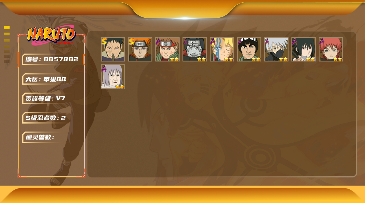 [8857474]xr38125-可修改-安q-3s级忍者数-6a级忍者数-战力131w 【s级忍者】:宇智波带土「忍界大战」3星,自来也「舞之豪杰」3星,佩恩「天道」3星 【a级忍者】:旗木卡卡西「幻之真容」2星,我爱罗「疾风传」2星,猿飞阿斯玛2星,宇智波佐助「须佐能乎」2星,宇智波带土「暴怒」2星,宇智波泉奈2星