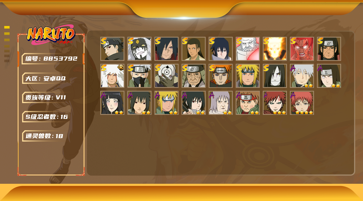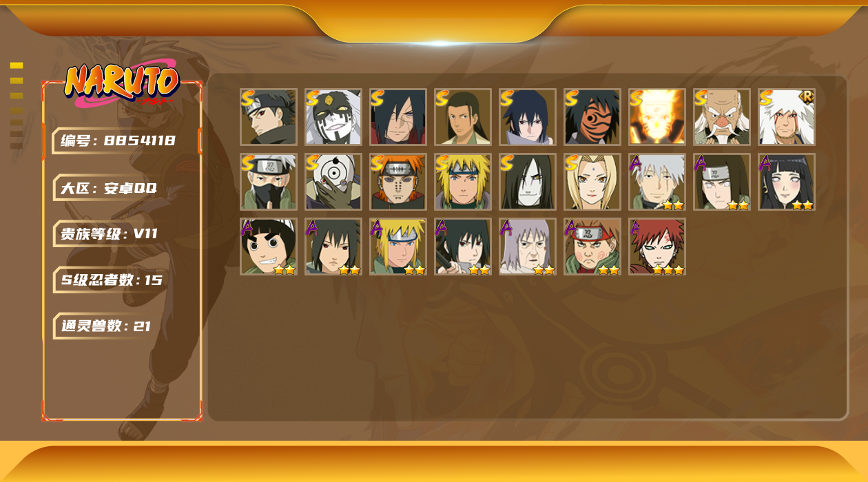 【hysa288】v11/战力645w/s忍9/a忍25/通灵兽15/2星日向宁次「忍界大战」/2星我爱罗「疾风传」/2星飞段「死司凭血」/2星宇智波鼬/2星药师兜「侠影江湖」/3星宇智波佐助「永恒万花筒」/3星宇智波鼬「秽土转生」/2星迈特凯/3星宇智波带土「忍界大战」/2星蝎/3星佩恩「天道」/2星照美冥「五代目水影」/3星波风水门/2星宇智波鼬「新春限定」/2星漩涡博人「桃式显现」/2星奇拉比「忍界大战」/2星卑留呼「火之意志继承者」/2星神秘面具男「忍者之路」/2星长十郎「六代目水影」/2星波风水门「青年」/3星自来也「舞之豪杰」/2星千手扉间「漂泊武士」/3星宇智波斑「白面具」/3星神秘面具男「红夜之刃」/2星迪达拉「秽土转生」/2星日向雏田「最终章」/2星猿飞阿斯玛/2星宇智波泉奈/2星干柿鬼鲛/3星宇智波斑「秽土转生·解」/2星艾「青年」/2星不缘/2星宇智波佐助「须佐能乎」/2星千代「近松十人卫」