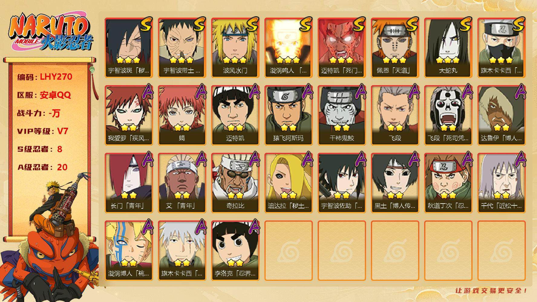 v7/s忍8/a忍20/2星我爱罗「疾风传」/2星达鲁伊「博人传」/2星飞段「死司凭血」/3星旗木卡卡西「须佐能乎」/2星长门「青年」/2星迈特凯/3星宇智波带土「忍界大战」/2星蝎/3星佩恩「天道」/3星波风水门/3星漩涡鸣人「九喇嘛连结」/2星秋道丁次「忍界大战」/2星漩涡博人「桃式显现」/2星李洛克「忍界大战」/3星迈特凯「死门」/2星黑土「博人传」/2星迪达拉「秽土转生」/2星奇拉比/2星飞段/2星猿飞阿斯玛/2星宇智波泉奈/2星旗木卡卡西「幻之真容」/2星干柿鬼鲛/3星大蛇丸/3星宇智波斑「秽土转生·解」/2星艾「青年」/2星宇智波佐助「须佐能乎」/2星千代「近松十人卫」