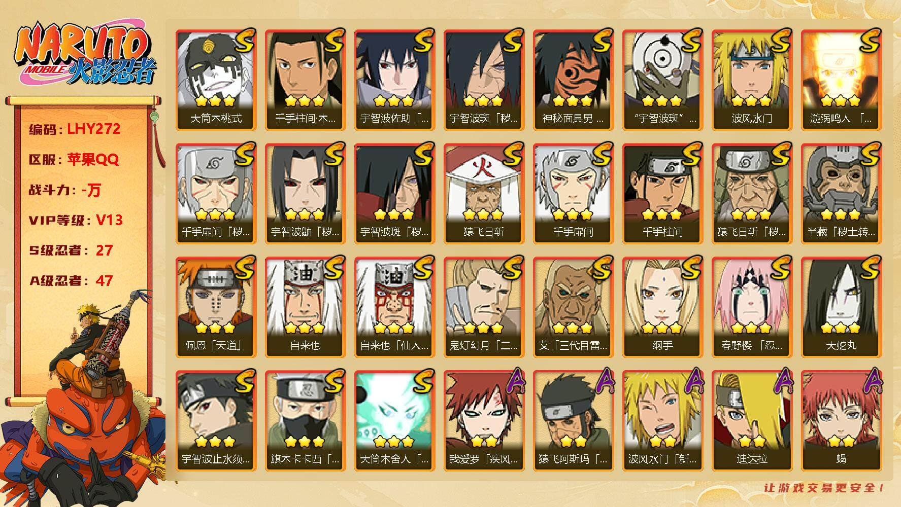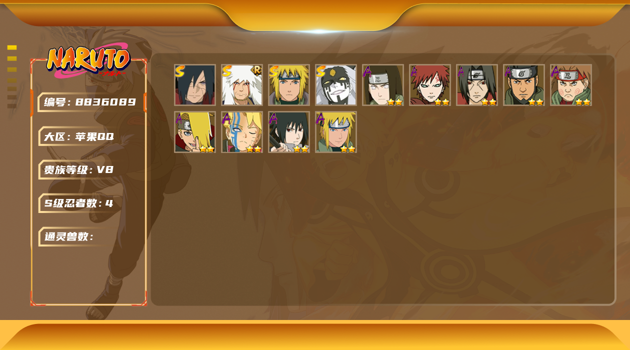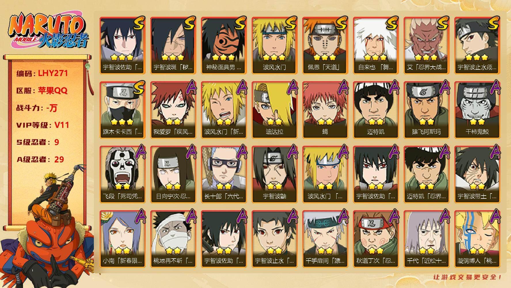 [8836089]xr38106-果q-可修改-战力276w-4s级忍者数-9a级忍者数 【s级忍者】:宇智波斑「秽土转生·解」3星,自来也「舞之豪杰」3星,波风水门3星,大筒木桃式3星 【a级忍者】:波风水门「青年」2星,迪达拉2星,漩涡博人「桃式显现」2星,我爱罗「疾风传」2星,猿飞阿斯玛2星,宇智波鼬2星,宇智波佐助「须佐能乎」2星,日向宁次「忍界大战」2星,秋道丁次「忍界大战」2星
