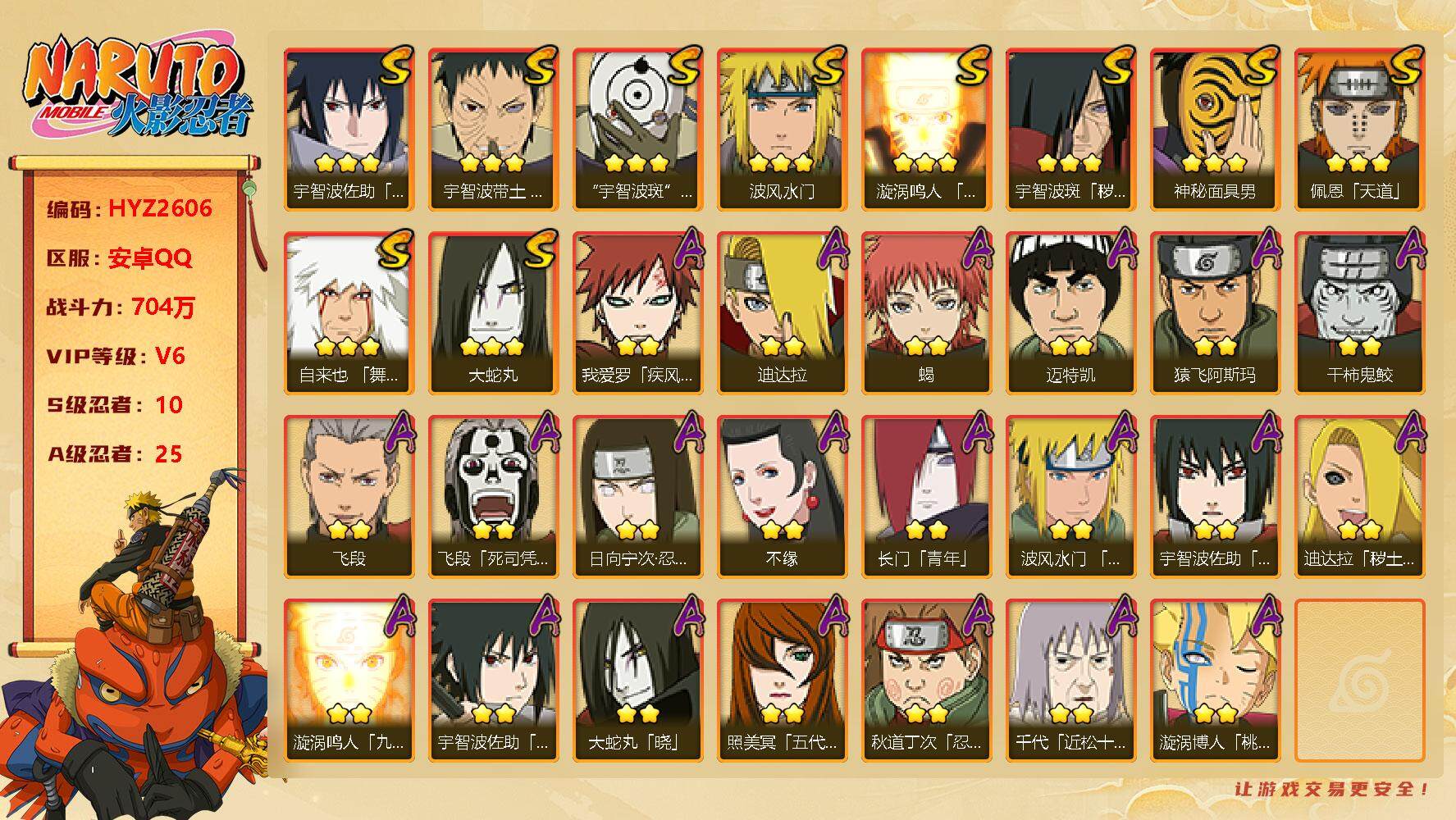 【hyz2606】v6/战力704w/s忍10/a忍25/3星宇智波斑「秽土转生」/2星日向宁次「忍界大战」/2星我爱罗「疾风传」/2星飞段「死司凭血」/3星宇智波佐助「永恒万花筒」/2星迈特凯/2星长门「青年」/3星宇智波带土「忍界大战」/2星蝎/3星佩恩「天道」/2星照美冥「五代目水影」/3星波风水门/3星漩涡鸣人「九喇嘛连结」/2星秋道丁次「忍界大战」/2星漩涡博人「桃式显现」/2星波风水门「青年」/3星自来也「舞之豪杰」/3星宇智波斑「白面具」/2星迪达拉「秽土转生」/2星飞段/2星猿飞阿斯玛/2星宇智波佐助「万花筒写轮眼」/2星迪达拉/2星干柿鬼鲛/3星大蛇丸/2星漩涡鸣人「九尾查克拉」/2星不缘/2星宇智波佐助「须佐能乎」/3星神秘面具男/2星千代「近松十人卫」/2星大蛇丸「晓」