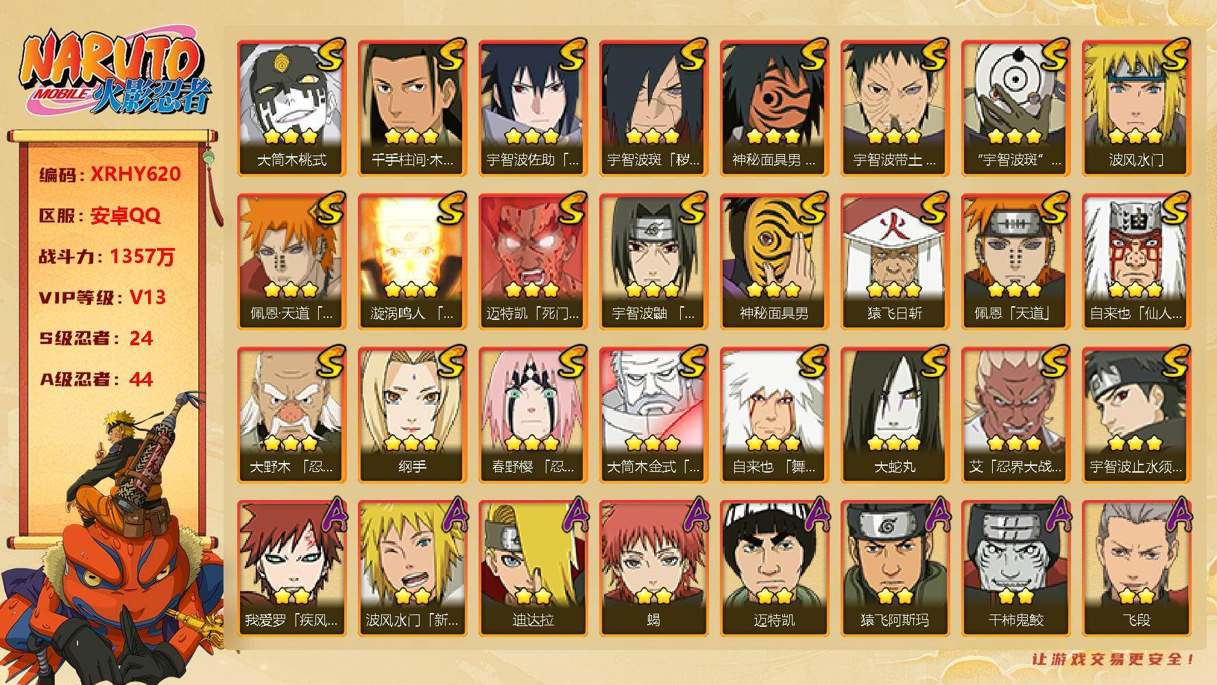 [8836750]xr38120-安卓q-24s级忍者数-44a级忍者数-战力1357w 【s级忍者】:宇智波斑「秽土转生·解」3星,大野木「忍界大战」3星,春野樱「忍界大战」3星,宇智波带土「忍界大战」3星,艾「忍界大战」3星,宇智波鼬「须佐能乎」3星,宇智波止水「须佐能乎」3星,千手柱间「木叶创立」3星,自来也「仙人模式」3星,自来也「舞之豪杰」3星,大蛇丸3星,纲手3星,猿飞日斩3星,波风水门3星,神秘面具男3星,神秘面具男「红夜之刃」3星,漩涡鸣人「九喇嘛连结」3星,迈特凯「死门」3星,佩恩「天道」3星,佩恩·天道「超」3星,宇智波佐助「永恒万花筒」3星,宇智波斑 「白面具」3星宇智波斑「白面具」,大筒木金式3星,大筒木桃式3星 【a级忍者】:艾「青年」2星,长门「青年」2星,波风水门「新春限定」2星,达鲁伊「博人传」2星,迪达拉2星,飞段2星,飞段「死司凭血」2星,干柿鬼鲛2星,漩涡博人「桃式显现」2星,死钱包,迈特凯2星,旗木卡卡西「幻之真容」2星,桃地再不斩「漂泊武士」2星,我爱罗「疾风传」2星,蝎2星,蝎「绯流琥」2星,小南「新春限定」2星,小南「夏日泳装」2星,小南「漂泊浪客」2星,角都「秽土转生」2星,猿飞阿斯玛2星,宇智波止水「新春限定」2星,宇智波鼬2星,宇智波鼬「新春限定」2星,宇智波佐助「须佐能乎」2星,宇智波佐助「万花筒写轮眼」2星,药师兜「侠影江湖」2星,照美冥「侠隐江湖」2星,照美冥「五代目水影」2星,日向宁次「忍界大战」2星,日向雏田「最终章」2星,长十郎「六代目水影」2星,纲手「侠隐江湖」2星,卑留呼「火之意志继承者」2星,神秘面具男「忍者之路」2星,佩恩·六道「漂泊浪客」2星,李洛克「忍界大战」2星,黑土「博人传」2星,千手扉间「漂泊武士」2星,春野樱「百豪」2星,秋道丁次「忍界大战」2星,千代「近松十人卫」2星,不缘2星,宇智波泉奈2星,不动2星