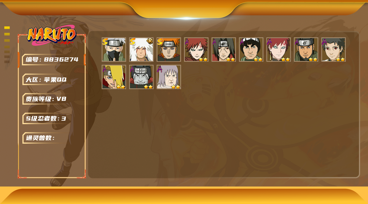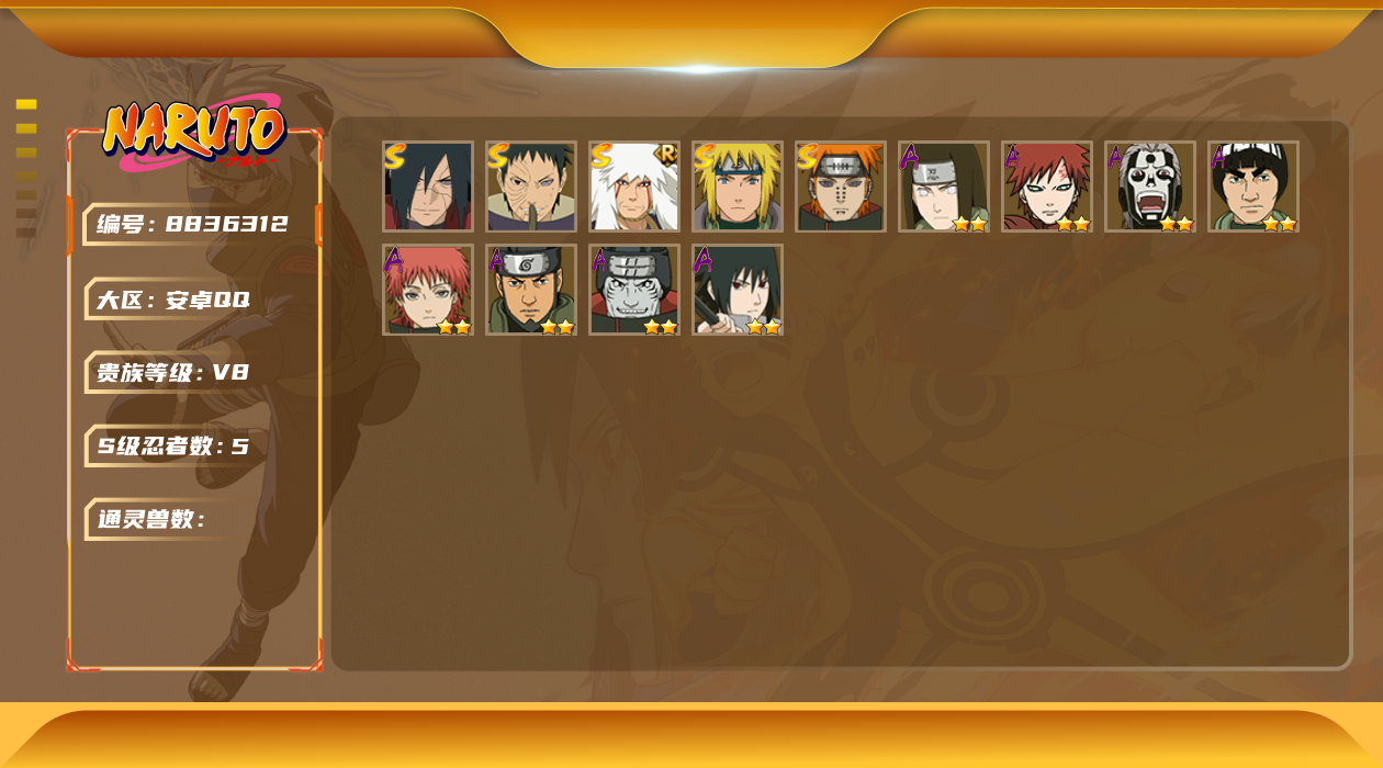 [8836312]xr38111-安卓q-区服3482-可修改-5s级忍者数-9a级忍者数 【s级忍者】:宇智波斑「秽土转生·解」3星,宇智波带土「忍界大战」3星,自来也「舞之豪杰」3星,波风水门3星,佩恩「天道」3星 【a级忍者】:飞段「死司凭血」2星,干柿鬼鲛2星,迈特凯2星,我爱罗「疾风传」2星,蝎2星,猿飞阿斯玛2星,宇智波佐助「须佐能乎」2星,日向宁次「忍界大战」2星,宇智波泉奈2星