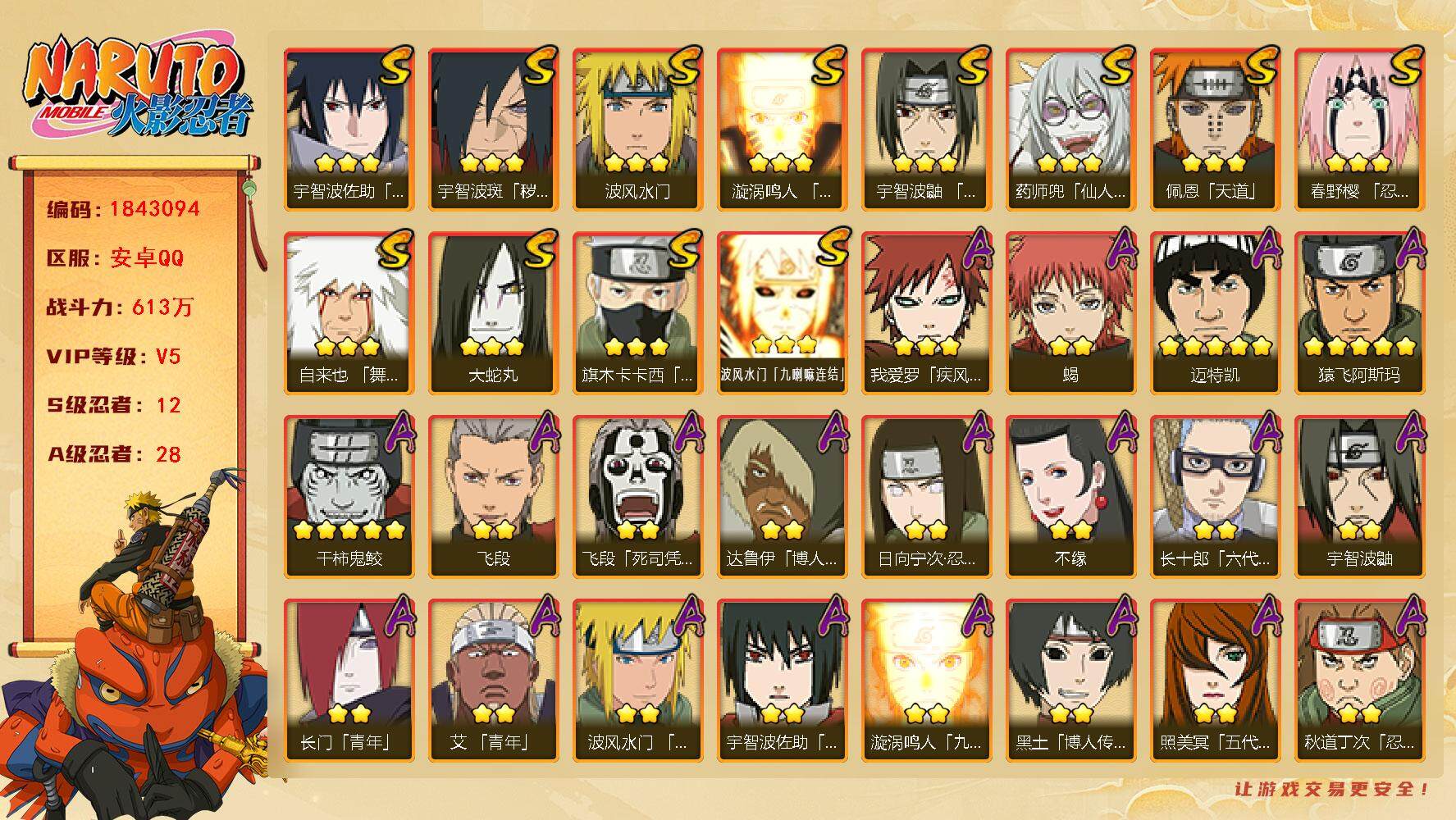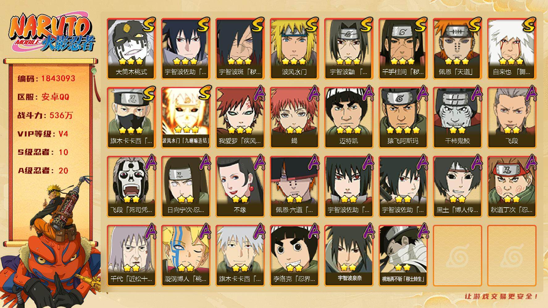 2288946-7s忍/32a忍/战力574w/v8/区服2934 【s忍者】 宇智波斑「秽土转生·解」,宇智波佐助「永恒万花筒」,自来也「舞之豪杰」,宇智波鼬「须佐能乎」,佩恩「天道」,波风水门,大蛇丸, 【a忍者】 长十郎「六代目水影」,日向宁次「忍界大战」,漩涡博人「桃式显现」,日向雏田「最终章」,李洛克「忍界大战」,宇智波泉奈,神农「羁绊」,桃地再不斩「秽土转生」,长门「青年」,佩恩