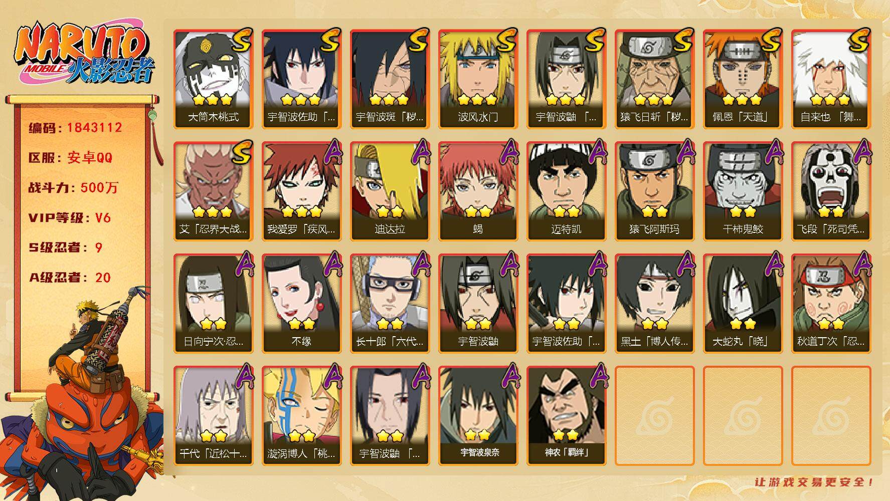 v6 12s忍 26a忍 14通灵 701.3w战力 可二次 可修改实名 【s级忍者】:艾「忍界大战」宇智波斑「秽土转生·解」千手柱间·木叶创立宇智波佐助「永恒万花筒」自来也 「舞之豪杰」旗木卡卡西「须佐能乎」宇智波斑「白面具」猿飞日斩「秽土转生」宇智波鼬 「须佐能乎」佩恩「天道