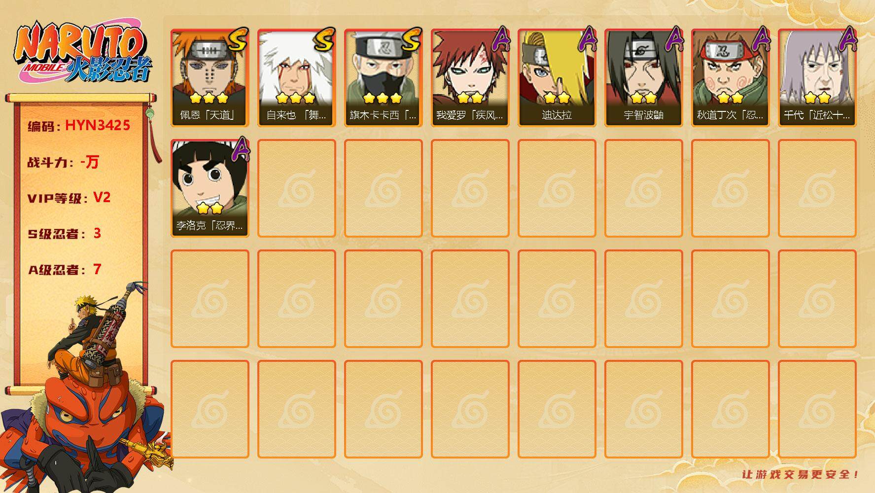 【hyn3425】v2/s忍3/a忍7/3星自来也「舞之豪杰」/2星宇智波泉奈/2星秋道丁次「忍界大战」/2星迪达拉/2星我爱罗「疾风传」/2星宇智波鼬/3星旗木卡卡西「须佐能乎」/2星李洛克「忍界大战」/3星佩恩「天道」/2星千代「近松十人卫」