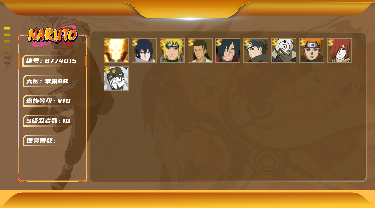 【hyn3438】v4/战力291w/s忍4/a忍9/通灵兽11/3星自来也「舞之豪杰」/2星我爱罗「疾风传」/蜃/2星飞段「死司凭血」/2星宇智波鼬/2星蝎/蛤蟆吉/3星佩恩「天道」/镰鼬/3星波风水门/2星宇智波泉奈/忍犬/山椒鱼/2星干柿鬼鲛/2星漩涡博人「桃式显现」/2星不缘/蓝蛇/砂之守鹤/猿魔/蛤蟆仙人/3星药师兜「仙人模式」/忍龟/鲛鲨/2星波风水门「青年」