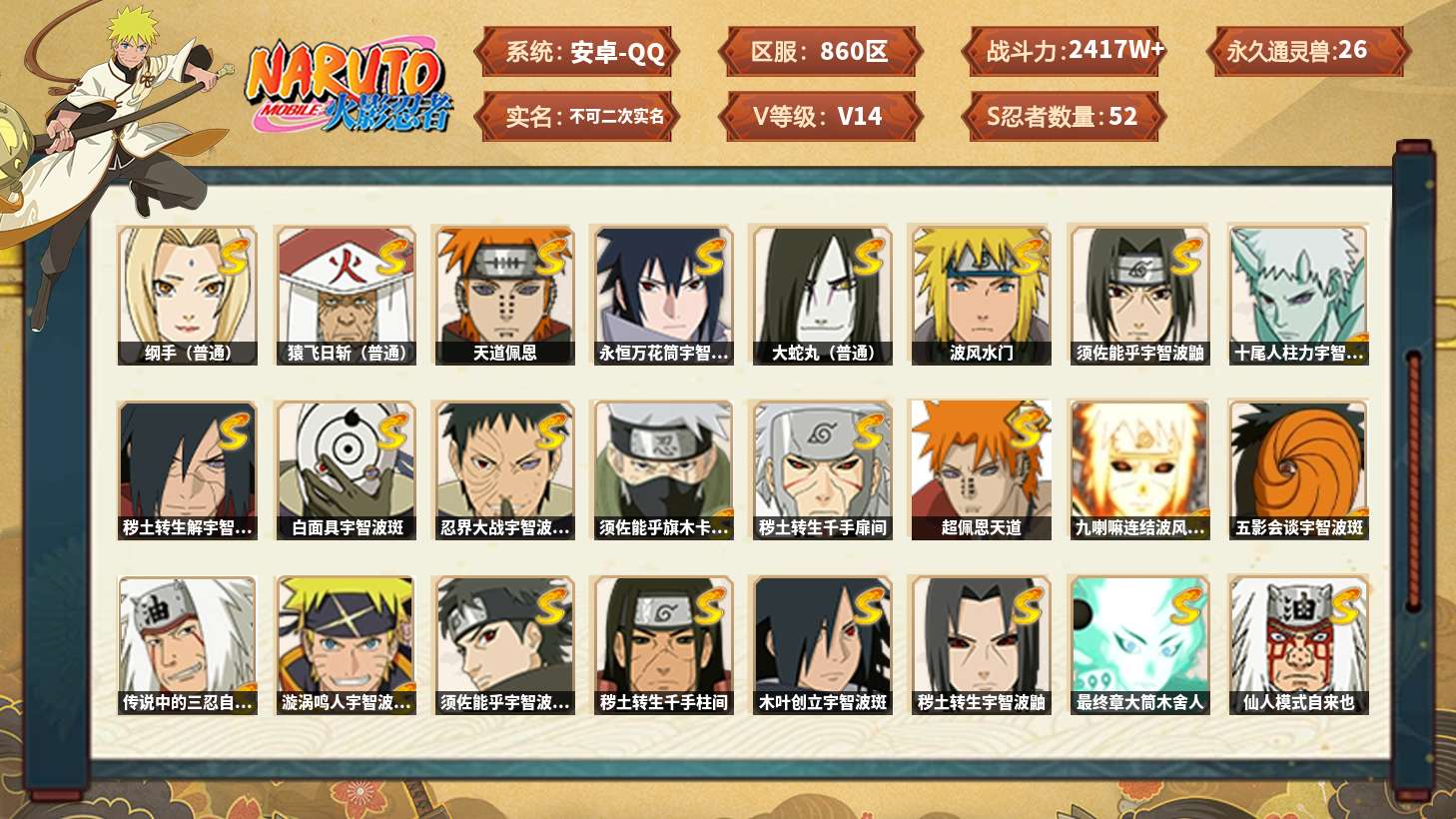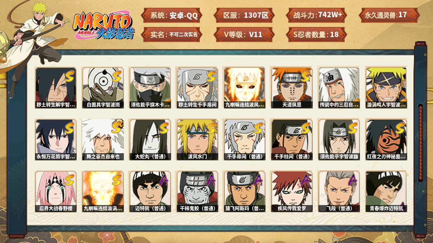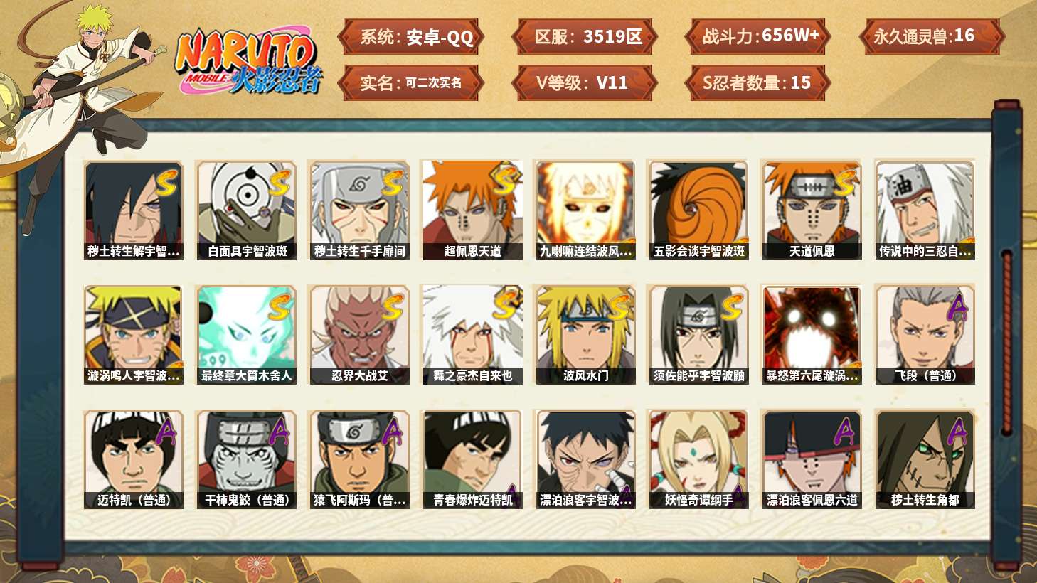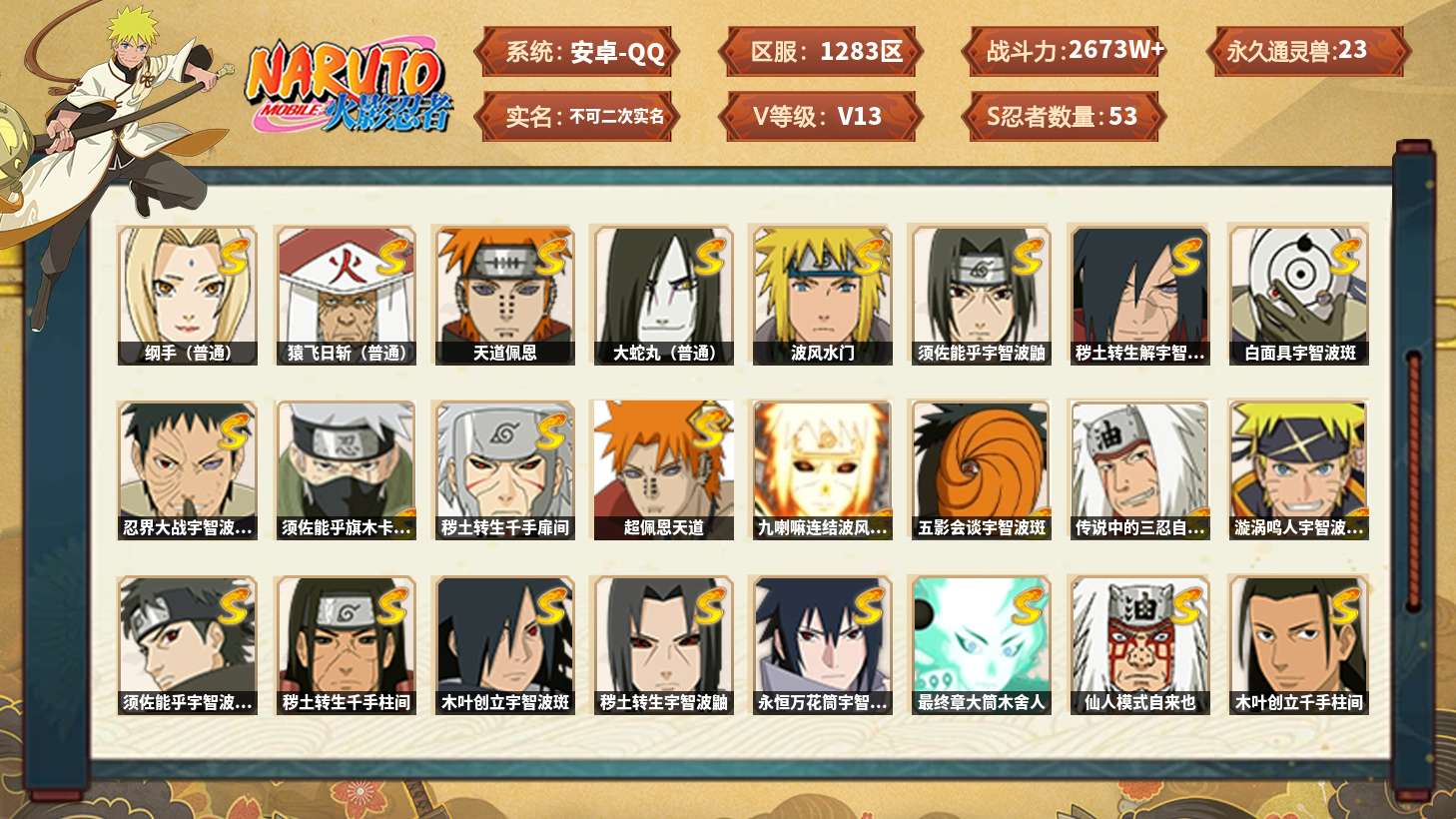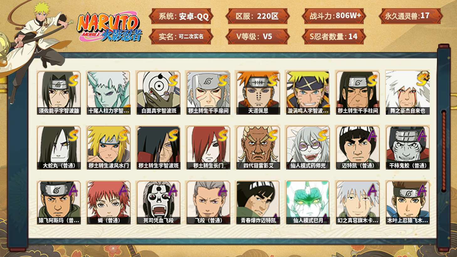 【s忍者7 a忍者24 通灵14】【安卓q-2299区-142级-v5-548万战力】【s级】自来也「舞之豪杰」 佩恩「天道」 波风水门 宇智波鼬「须佐能乎」 漩涡鸣人「九喇嘛连结」 宇智波斑「白面具」 大蛇丸【a级】药师兜「半蛇斗篷」 迈特凯 照美冥「五代目水影」 千代「近松十人卫」 迈特凯「青春爆炸」 宇智波泉奈 漩涡博人「桃式显现」 长门「青年」 飞段「死司凭血」 蝎 猿飞阿斯玛 艾「青年」