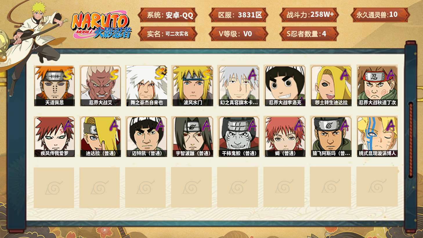 【火影忍者】【lyhy11132】战斗力:258w;段位:见习1阶;本服排名:41077;vip:v0级;s忍:4个;a忍:12个;通灵兽:10个,s忍:天道佩恩|忍界大战艾|舞之豪杰自来也|波风水门__a忍:幻之真容旗木卡卡西|忍界大战李洛克|秽土转生迪达拉|忍界大战秋道丁次|疾风传我爱罗|迪达拉(普通)|迈特凯(普通)|宇智波鼬(普通)|干柿鬼鲛(普通)|蝎(普通)|猿飞阿斯玛(普通)|桃式显现漩涡博人__通灵兽:忍犬(普通)|蓝蛇|蛤蟆吉|忍龟|镰鼬|猿魔|山椒鱼|蜃|蛤蟆仙人|鲛鲨
