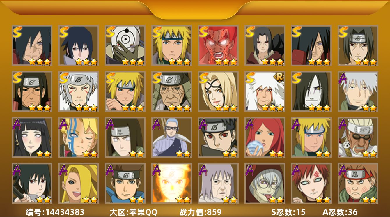 [14434383]v5859w战力,15s忍,36a忍,金水门84片,四代目雷影54片。me1714 【s级忍者】:猿飞日斩「秽土转生」3星,波风水门「秽土转生」3星,千手柱间「秽土转生」3星,宇智波鼬「秽土转生」3星,宇智波斑「秽土转生」3星,宇智波斑「秽土转生·解」3星,宇智波鼬「须佐能乎」3星,自来也「舞之豪杰」3星,大蛇丸3星,纲手「百豪」3星,千手扉间3星,波风水门3星,迈特凯「死门」3星,宇智波佐助「永恒万花筒」3星,宇智波斑 「白面具」3星宇智波斑「白面具」 【a级忍者】:波风水门「青年」2星,达鲁伊「博人传」2星,迪达拉2星,迪达拉「秽土转生」2星,大蛇丸「晓」2星,奇拉比2星,奇拉比「忍界大战」2星,飞段4星,飞段「死司凭血」2星,干柿鬼鲛5星,漩涡博人「桃式显现」2星,漩涡鸣人「仙人模式」2星,漩涡鸣人「九尾查克拉」2星,迈特凯5星,旗木卡卡西「万花筒写轮眼」2星,旗木卡卡西「幻之真容」2星,桃地再不斩「秽土转生」2星,我爱罗「疾风传」4星,我爱罗「忍界大战」2星,蝎3星,猿飞阿斯玛5星,宇智波止水2星,宇智波鼬2星,宇智波佐助「须佐能乎」2星,宇智波佐助「万花筒写轮眼」2星,药师兜「半蛇斗篷」2星,照美冥「五代目水影」2星,日向宁次「忍界大战」2星,日向雏田「最终章」2星,长十郎「六代目水影」2星,猿飞木叶丸「博人传」2星,黑土「博人传」2星,春野樱「百豪」2星,秋道丁次「忍界大战」2星,千代「近松十人卫」2星,不风2星