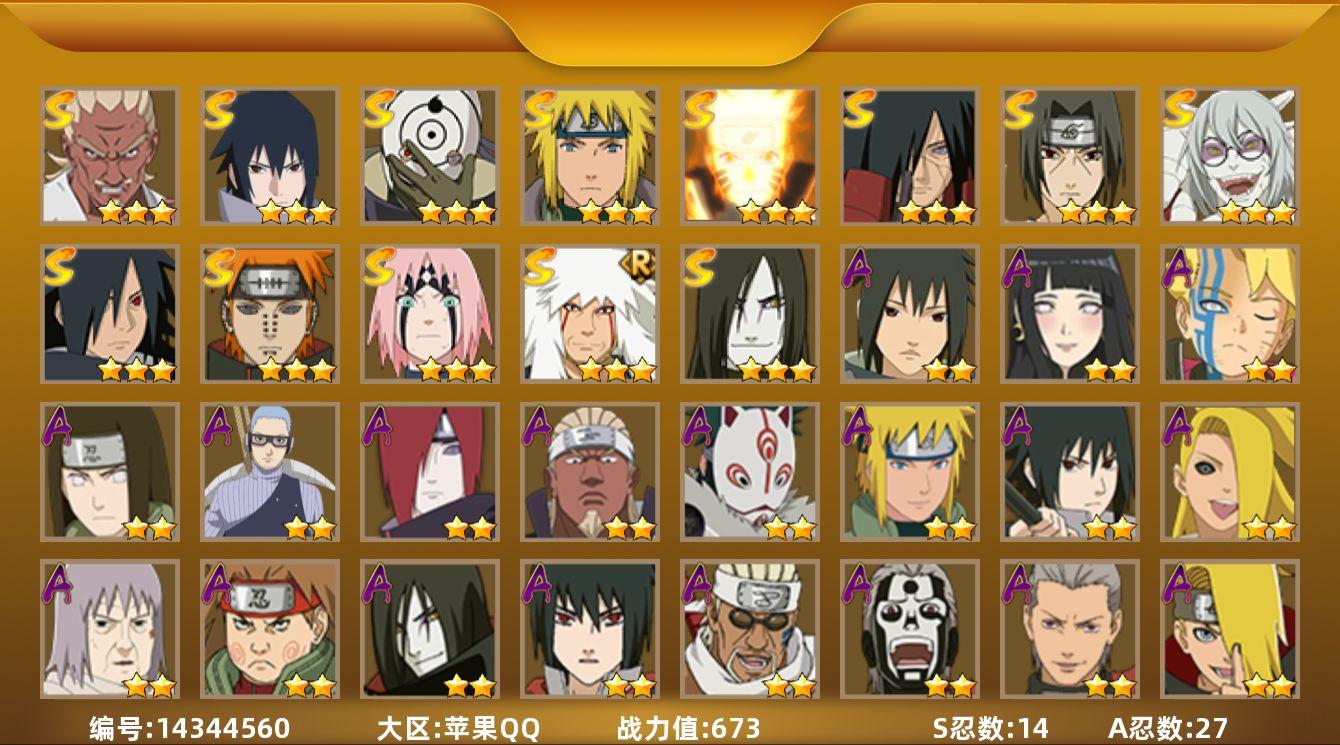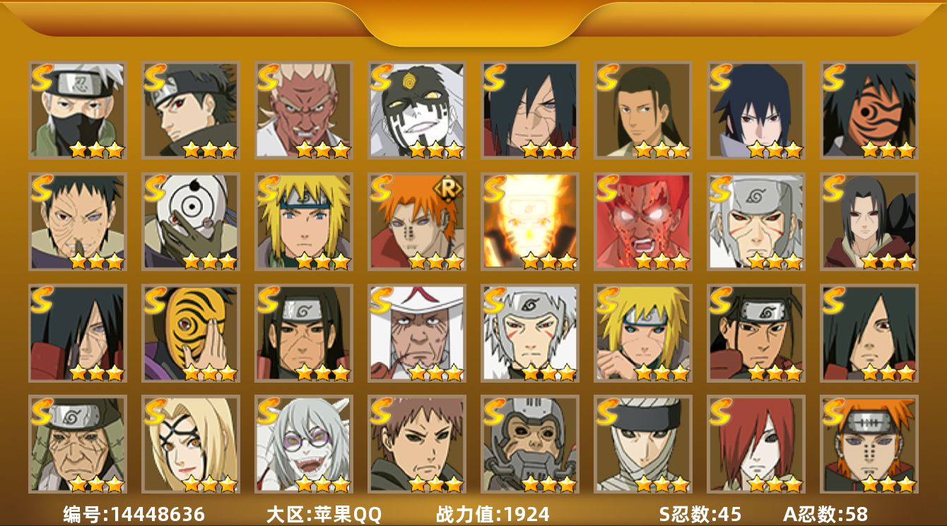 [14448636]v12 1924万战力 45s级忍者数-58a级忍者数 九喇嘛水门55片 最终章舍人87片 1885点券 sr4074 【s级忍者】:长门「秽土转生」3星,半藏「秽土转生」3星,猿飞日斩「秽土转生」3星,波风水门「秽土转生」3星,千手扉间「秽土转生」3星,千手柱间「秽土转生」3星,宇智波鼬「秽土转生」3星,宇智波斑「秽土转生」3星,宇智波斑「秽土转生·解」3星,大野木「忍界大战」3星,春野樱「忍界大战」3星,宇智波带土「忍界大战」3星,艾「忍界大战」3星,宇智波鼬「须佐能乎」4星,宇智波止水「须佐能乎」3星,旗木卡卡西「须佐能乎」3星,千手柱间「木叶创立」3星,无「二代目土影」3星,艾「四代目雷影」3星,罗砂「四代目风影」3星,鬼灯幻月「二代目水影」3星,自来也3星,自来也「仙人模式」3星,自来也「舞之豪杰」3星,大蛇丸4星,自来也「传说中的三忍」3星,纲手5星,纲手「百豪」3星,千手柱间3星,千手扉间3星,猿飞日斩5星,宇智波斑3星,波风水门3星,药师兜「仙人模式」3星,神秘面具男3星,神秘面具男「红夜之刃」3星,漩涡鸣人「九喇嘛连结」3星,迈特凯「死门」3星,佩恩「天道」3星,佩恩·天道「超」3星,宇智波佐助「永恒万花筒」3星,宇智波斑 「白面具」3星宇智波斑「白面具」,大筒木金式3星,大筒木桃式3星,漩涡鸣人「暴怒·第六尾」3星 【a级忍者】:艾「青年」2星,长门「青年」2星,波风水门「青年」2星,达鲁伊「博人传」2星,迪达拉2星,迪达拉「秽土转生」2星,大蛇丸「晓」2星,奇拉比2星,奇拉比「忍界大战」2星,飞段4星,飞段「死司凭血」5星,干柿鬼鲛5星,漩涡博人「桃式显现」2星,漩涡鸣人「仙人模式」2星,漩涡鸣人「九尾查克拉」2星,迈特凯5星,旗木卡卡西「万花筒写轮眼」2星,旗木卡卡西「幻之真容」2星,桃地再不斩「秽土转生」2星,我爱罗「疾风传」4星,我爱罗「忍界大战」2星,蝎5星,蝎「绯流琥」2星,小南2星,小南「夏日泳装」2星,小南「漂泊浪客」2星,角都「秽土转生」2