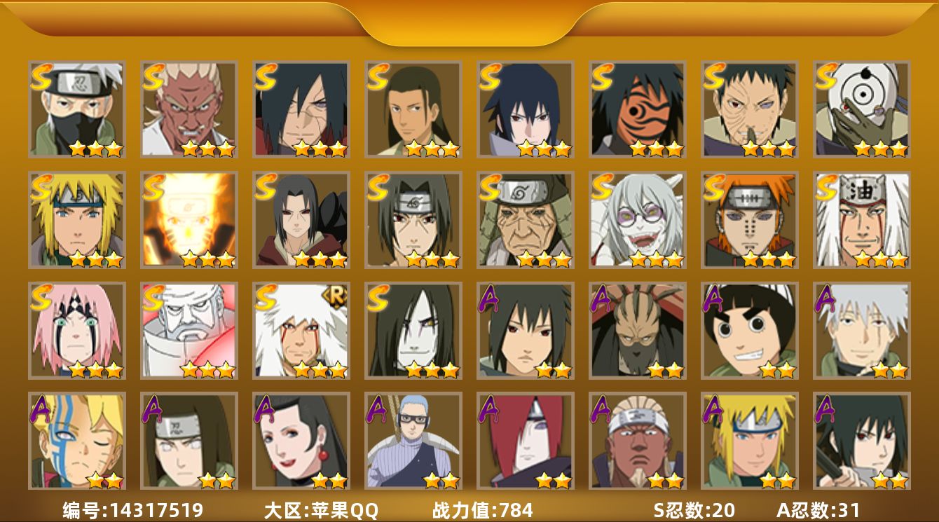 [14317519]v8 20s 31a 784w战力 罗砂55片 纲手61片 新水门62片(王者连体96皮肤) yy1293 【s级忍者】:猿飞日斩「秽土转生」3星,宇智波鼬「秽土转生」3星,宇智波斑「秽土转生·解」3星,春野樱「忍界大战」3星,宇智波带土「忍界大战」3星,艾「忍界大战」3星,宇智波鼬「须佐能乎」3星,旗木卡卡西「须佐能乎」3星,千手柱间「木叶创立」3星,自来也3星,自来也「舞之豪杰」3星,大蛇丸3星,波风水门3星,药师兜「仙人模式」3星,神秘面具男「红夜之刃」3星,漩涡鸣人「九喇嘛连结」3星,佩恩「天道」3星,宇智波佐助「永恒万花筒」3星,宇智波斑 「白面具」3星宇智波斑「白面具」,大筒木金式3星 【a级忍者】:艾「青年」2星,长门「青年」2星,波风水门「青年」2星,达鲁伊「博人传」2星,迪达拉「秽土转生」2星,奇拉比2星,飞段3星,飞段「死司凭血」2星,干柿鬼鲛5星,漩涡博人「桃式显现」2星,漩涡鸣人「仙人模式」2星,漩涡鸣人「九尾查克拉」2星,迈特凯5星,旗木卡卡西「万花筒写轮眼」2星,旗木卡卡西「幻之真容」2星,我爱罗「疾风传」3星,蝎5星,蝎「绯流琥」2星,猿飞阿斯玛5星,宇智波鼬2星,宇智波佐助「须佐能乎」2星,宇智波佐助「万花筒写轮眼」2星,日向宁次「忍界大战」2星,长十郎「六代目水影」2星,李洛克「忍界大战」2星,黑土「博人传」2星,秋道丁次「忍界大战」2星,千代「近松十人卫」2星,神农「羁绊」2星,不缘2星,宇智波泉奈2星