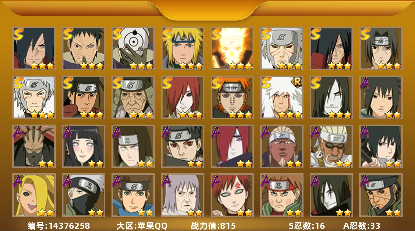 [14282363]v11 19s 32a 1240万战力 须佐卡卡西60片 传说自来也79片 秽土解斑50片 白面具63片 忍战艾68片 鬼灯幻月58片 大野木75片 zp3144 【s级忍者】:千手柱间「秽土转生」3星,宇智波鼬「秽土转生」3星,大野木「忍界大战」3星,春野樱「忍界大战」3星,宇智波带土「忍界大战」3星,宇智波鼬「须佐能乎」3星,宇智波斑「木叶创立」3星,自来也3星,自来也「仙人模式」3星,自来也「舞之豪杰」3星,大蛇丸3星,纲手5星,猿飞日斩4星,波风水门4星,神秘面具男「红夜之刃」3星,漩涡鸣人「九喇嘛连结」3星,迈特凯「死门」3星,佩恩「天道」3星,宇智波佐助「永恒万花筒」3星 【a级忍者】:艾「青年」2星,长门「青年」2星,波风水门「青年」3星,达鲁伊「博人传」2星,迪达拉2星,迪达拉「秽土转生」2星,奇拉比2星,奇拉比「忍界大战」2星,飞段3星,飞段「死司凭血」2星,干柿鬼鲛5星,漩涡鸣人「九尾查克拉」2星,迈特凯5星,桃地再不斩「秽土转生」2星,我爱罗「疾风传」4星,蝎5星,蝎「绯流琥」2星,猿飞阿斯玛5星,宇智波鼬2星,宇智波佐助「须佐能乎」2星,宇智波佐助「万花筒写轮眼」2星,照美冥「侠隐江湖」2星,照美冥「五代目水影」2星,日向宁次「忍界大战」2星,长十郎「六代目水影」2星,佩恩·六道「漂泊浪客」2星,李洛克「忍界大战」2星,千手扉间「漂泊武士」2星,秋道丁次「忍界大战」2星,千代「近松十人卫」2星,宇智波泉奈2星,不动2星