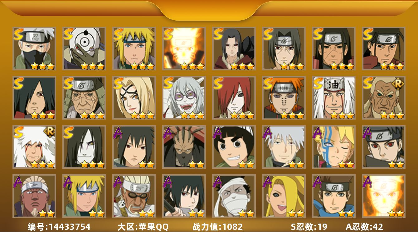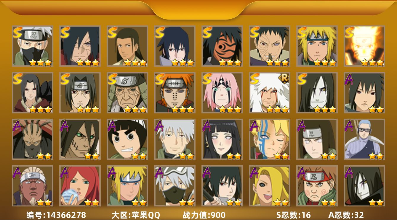 [14282363]v11 19s 32a 1240万战力 须佐卡卡西60片 传说自来也79片 秽土解斑50片 白面具63片 忍战艾68片 鬼灯幻月58片 大野木75片 zp3144 【s级忍者】:千手柱间「秽土转生」3星,宇智波鼬「秽土转生」3星,大野木「忍界大战」3星,春野樱「忍界大战」3星,宇智波带土「忍界大战」3星,宇智波鼬「须佐能乎」3星,宇智波斑「木叶创立」3星,自来也3星,自来也「仙人模式」3星,自来也「舞之豪杰」3星,大蛇丸3星,纲手5星,猿飞日斩4星,波风水门4星,神秘面具男「红夜之刃」3星,漩涡鸣人「九喇嘛连结」3星,迈特凯「死门」3星,佩恩「天道」3星,宇智波佐助「永恒万花筒」3星 【a级忍者】:艾「青年」2星,长门「青年」2星,波风水门「青年」3星,达鲁伊「博人传」2星,迪达拉2星,迪达拉「秽土转生」2星,奇拉比2星,奇拉比「忍界大战」2星,飞段3星,飞段「死司凭血」2星,干柿鬼鲛5星,漩涡鸣人「九尾查克拉」2星,迈特凯5星,桃地再不斩「秽土转生」2星,我爱罗「疾风传」4星,蝎5星,蝎「绯流琥」2星,猿飞阿斯玛5星,宇智波鼬2星,宇智波佐助「须佐能乎」2星,宇智波佐助「万花筒写轮眼」2星,照美冥「侠隐江湖」2星,照美冥「五代目水影」2星,日向宁次「忍界大战」2星,长十郎「六代目水影」2星,佩恩·六道「漂泊浪客」2星,李洛克「忍界大战」2星,千手扉间「漂泊武士」2星,秋道丁次「忍界大战」2星,千代「近松十人卫」2星,宇智波泉奈2星,不动2星