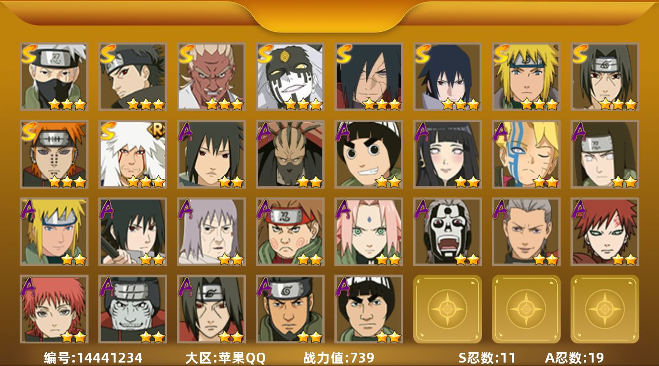 [14441234]v8 739万战力 11s忍-19a忍 tt1253 【s级忍者】:宇智波斑「秽土转生·解」3星,艾「忍界大战」3星,宇智波鼬「须佐能乎」3星,宇智波止水「须佐能乎」3星,旗木卡卡西「须佐能乎」3星,自来也「舞之豪杰」3星,自来也「传说中的三忍」3星,波风水门3星,佩恩「天道」3星,宇智波佐助「永恒万花筒」3星,大筒木桃式3星 【a级忍者】:波风水门「青年」2星,飞段2星,飞段「死司凭血」3星,干柿鬼鲛5星,漩涡博人「桃式显现」2星,迈特凯5星,我爱罗「疾风传」3星,蝎3星,蝎「绯流琥」2星,猿飞阿斯玛5星,宇智波鼬2星,宇智波佐助「须佐能乎」2星,日向宁次「忍界大战」2星,日向雏田「最终章」2星,李洛克「忍界大战」2星,春野樱「百豪」2星,秋道丁次「忍界大战」2星,千代「近松十人卫」2星,宇智波泉奈2星