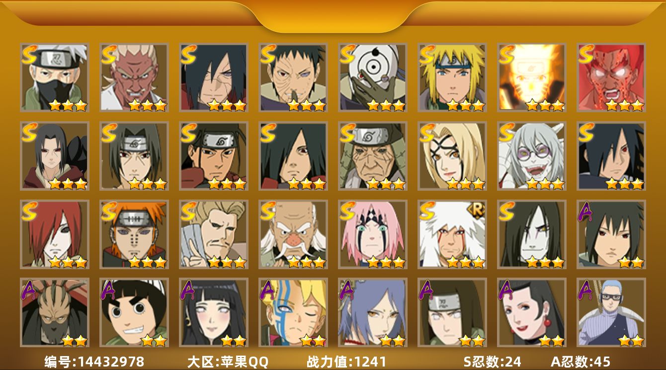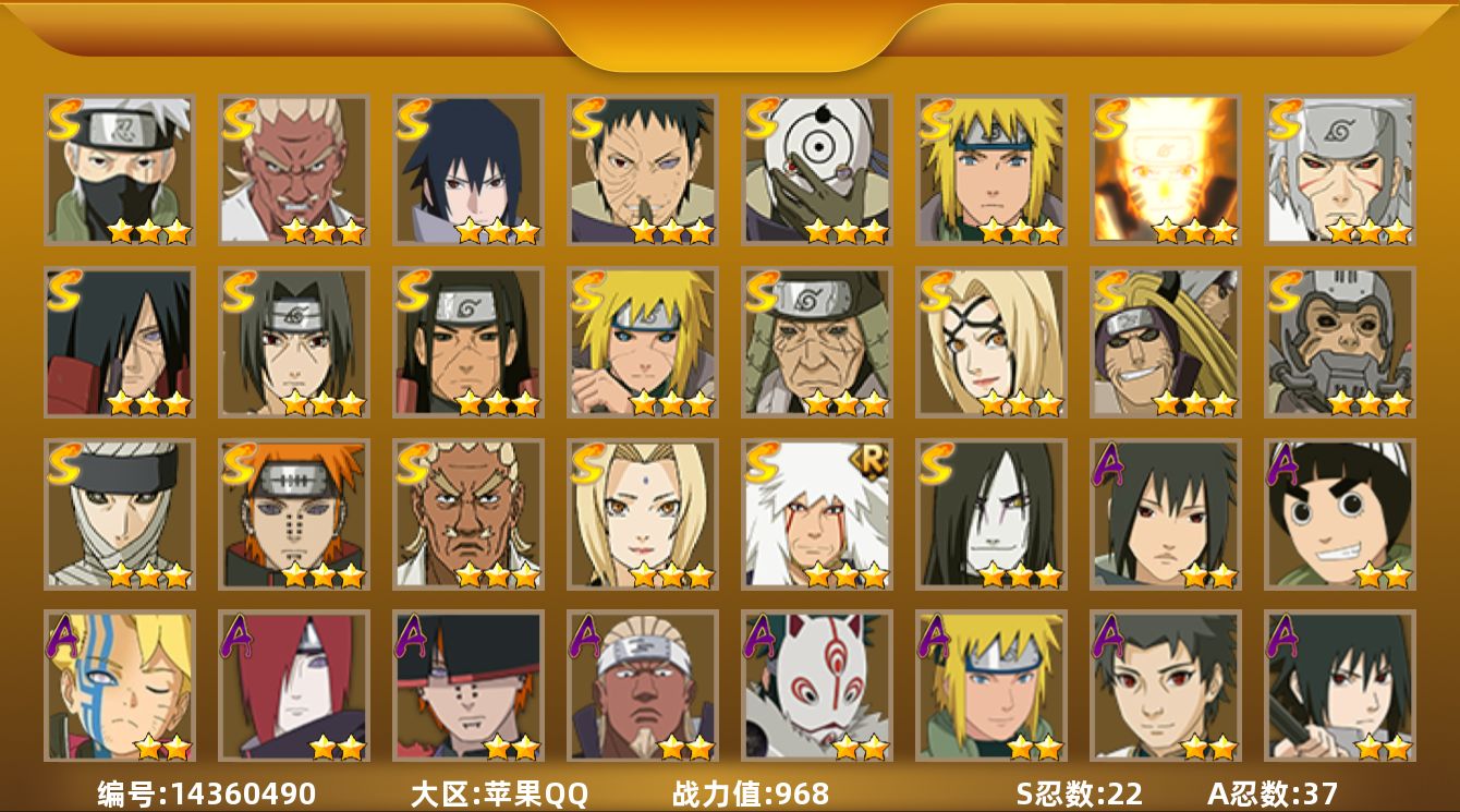 [14360490]v13 968万战力 22s忍 37a忍有熊猫 止水60片 ll5508 【s级忍者】:半藏「秽土转生」3星,金角·银角「秽土转生」3星,猿飞日斩「秽土转生」3星,波风水门「秽土转生」3星,千手扉间「秽土转生」3星,千手柱间「秽土转生」3星,宇智波斑「秽土转生」3星,宇智波带土「忍界大战」3星,艾「忍界大战」3星,宇智波鼬「须佐能乎」3星,旗木卡卡西「须佐能乎」3星,无「二代目土影」3星,艾「四代目雷影」3星,自来也「舞之豪杰」3星,大蛇丸3星,纲手3星,纲手「百豪」3星,波风水门3星,漩涡鸣人「九喇嘛连结」3星,佩恩「天道」3星,宇智波佐助「永恒万花筒」3星,宇智波斑 「白面具」3星宇智波斑「白面具」 【a级忍者】:艾「青年」2星,长门「青年」2星,波风水门「青年」2星,波风水门「新春限定」2星,达鲁伊「博人传」2星,迪达拉「秽土转生」2星,大蛇丸「晓」2星,奇拉比2星,飞段4星,飞段「死司凭血」2星,干柿鬼鲛5星,漩涡博人「桃式显现」2星,漩涡鸣人「仙人模式」2星,漩涡鸣人「九尾查克拉」2星,迈特凯5星,旗木卡卡西「万花筒写轮眼」2星,我爱罗「疾风传」3星,我爱罗「忍界大战」3星,蝎4星,小南「新春限定」2星,角都「地怨虞」2星,猿飞阿斯玛5星,宇智波止水「新春限定」2星,宇智波鼬「新春限定」2星,宇智波佐助「须佐能乎」2星,宇智波佐助「疾风传咒印」2星,宇智波佐助「万花筒写轮眼」2星,药师兜「半蛇斗篷」2星,宇智波带土「暴怒」2星,神秘面具男「忍者之路」2星,佩恩·六道「漂泊浪客」2星,李洛克「忍界大战」2星,猿飞木叶丸「博人传」2星,春野樱「百豪」2星,秋道丁次「忍界大战」2星,千代「近松十人卫」2星,宇智波泉奈2星