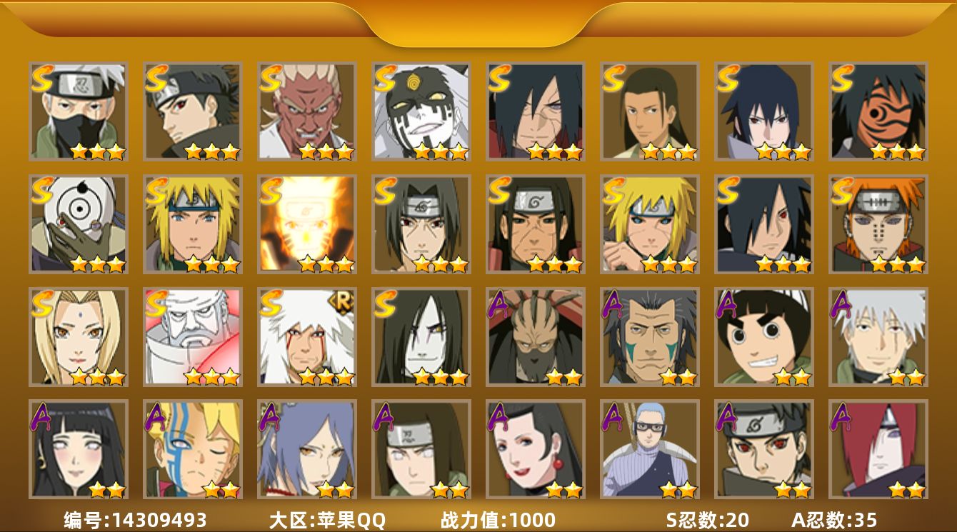 [14309493]v10,1000w战力 20s忍 35a忍 190忍,仙人兜58片,1.7w金币,1.5k点券,50高招券, me1358 【s级忍者】:波风水门「秽土转生」3星,千手柱间「秽土转生」3星,宇智波斑「秽土转生·解」3星,艾「忍界大战」3星,宇智波鼬「须佐能乎」3星,宇智波止水「须佐能乎」3星,旗木卡卡西「须佐能乎」3星,宇智波斑「木叶创立」3星,千手柱间「木叶创立」3星,自来也「舞之豪杰」3星,大蛇丸3星,纲手3星,波风水门3星,神秘面具男「红夜之刃」3星,漩涡鸣人「九喇嘛连结」3星,佩恩「天道」3星,宇智波佐助「永恒万花筒」3星,宇智波斑 「白面具」3星宇智波斑「白面具」,大筒木金式3星,大筒木桃式3星 【a级忍者】:艾「青年」2星,长门「青年」2星,波风水门「青年」2星,迪达拉2星,迪达拉「秽土转生」2星,奇拉比2星,飞段3星,飞段「死司凭血」3星,干柿鬼鲛5星,漩涡博人「桃式显现」2星,漩涡鸣人「仙人模式」2星,迈特凯5星,旗木卡卡西「忍界大战」2星,旗木卡卡西「幻之真容」2星,我爱罗「疾风传」4星,蝎4星,蝎「绯流琥」2星,小南「漂泊浪客」2星,猿飞阿斯玛5星,宇智波止水2星,猿飞日斩「火影继承人」2星,宇智波鼬2星,宇智波佐助「须佐能乎」2星,宇智波佐助「万花筒写轮眼」2星,日向宁次「忍界大战」2星,日向雏田「最终章」2星,长十郎「六代目水影」2星,李洛克「忍界大战」2星,猿飞木叶丸「博人传」2星,黑土「博人传」2星,秋道丁次「忍界大战」2星,千代「近松十人卫」2星,不缘2星,不风2星,不动2星