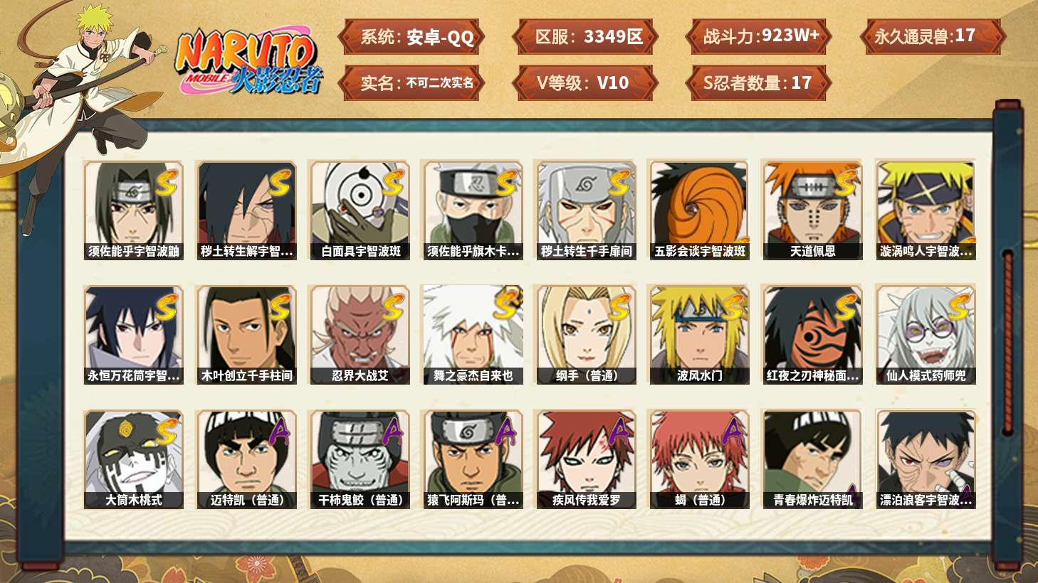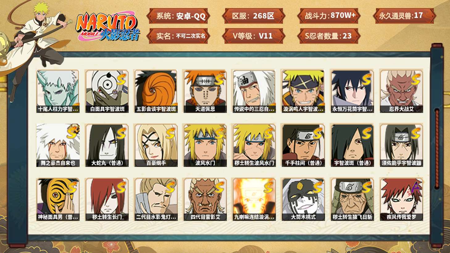 【火影忍者】【lyhy10950】战斗力:870w;段位:超影;本服排名:868;vip:v11级;s忍:23个;a忍:38个;通灵兽:17个,s忍:十尾人柱力宇智波带土|白面具宇智波斑|五影会谈宇智波斑|天道佩恩|传说中的三忍自来也|漩涡鸣人宇智波佐助|永恒万花筒宇智波佐助|忍界大战艾|舞之豪杰自来也|大蛇丸(普通)|百豪纲手|波风水门|秽土转生波风水门|千手柱间(普通)|宇智波斑(普通)|须佐能乎宇智波鼬|神秘面具男(普通)|秽土转生长门|二代目水影鬼灯幻月|四代目雷影艾|九喇嘛连结漩涡鸣人|大筒木桃式|秽土转生猿飞日斩__a忍:青春爆炸迈特凯|漂泊浪客宇智波带土|妖怪奇谭纲手|仙人模式巳月|秽土转生角都|忍界大战日向宁次|四代目土影黑土|青年长门|宇智波止水(普通)|青年波风水门|近松十人卫千代|半蛇斗篷药师兜|须佐能乎宇智波佐助|九尾查克拉漩涡鸣人|晓大蛇丸|百豪春野樱|忍界大战秋道丁次|忍界大战我爱罗|奇拉比(普通)|万花筒写轮眼宇智波佐助|五代目水影照美冥|死司凭血飞段 3星|疾风传我爱罗 4星|飞段(普通) 4星|小南(普通)|仙人模式漩涡鸣人|迈特凯(普通) 4星|宇智波鼬(普通)|干柿鬼鲛(普通) 4星|蝎(普通) 3星|绯流琥蝎|猿飞阿斯玛(普通) 3星|桃式显现漩涡博人|六代目水影长十郎|不缘|宇智波泉奈|初始形态机械鸣人|侠隐江湖大野木__通灵兽:忍犬(普通)|蓝蛇|蛤蟆吉|忍龟|镰鼬|猿魔|山椒鱼|蜃|蛞蝓(普通)|蛤蟆仙人|鲛鲨|蛤蟆健|乌鸦(普通)|砂之守鹤|蛤蟆龙|蛤蟆广|螃蟹