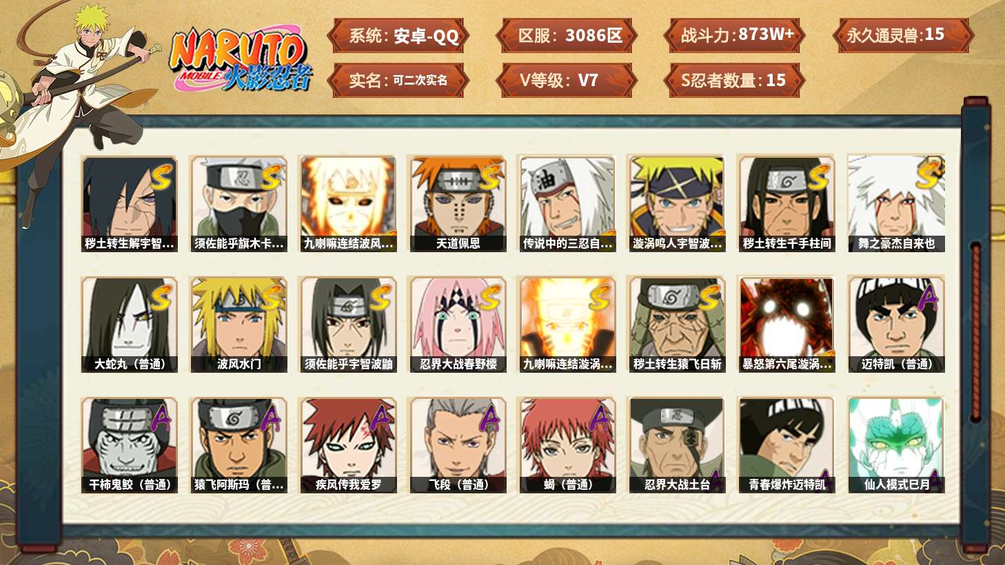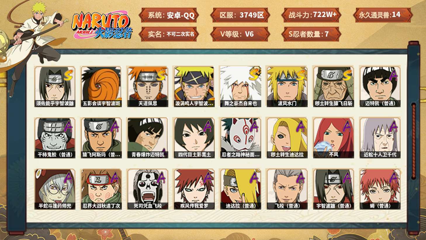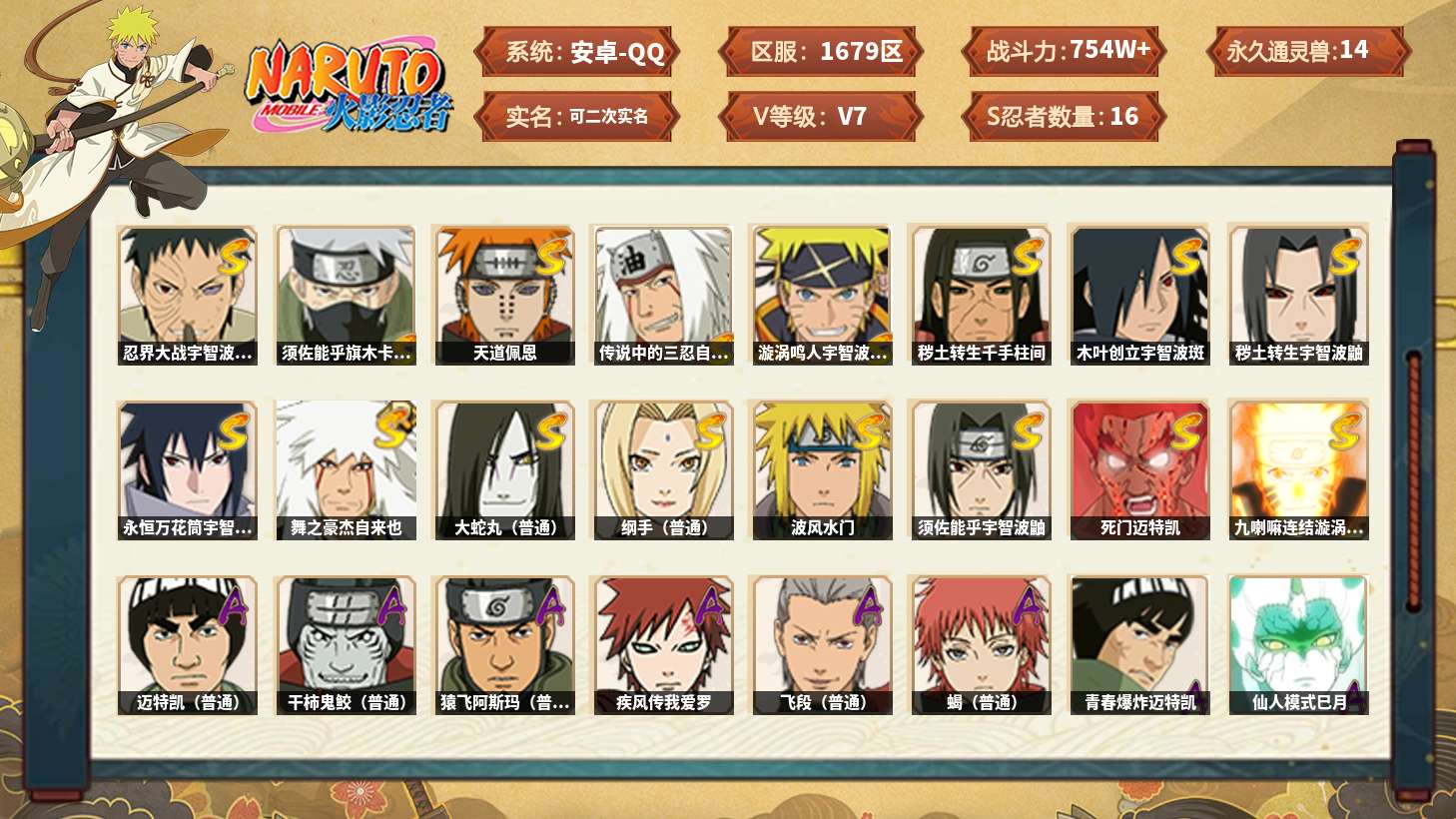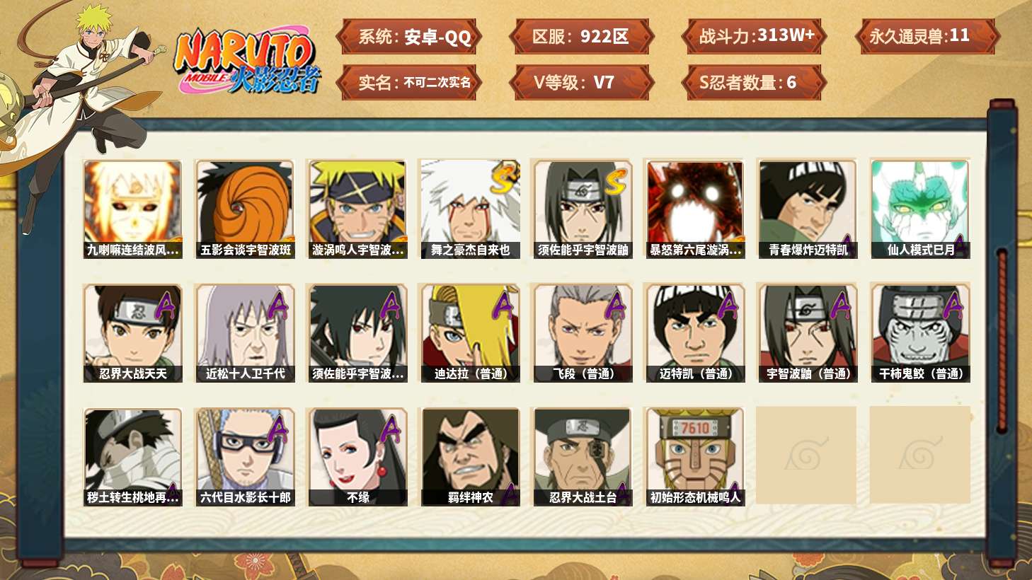 【火影忍者】【lyhy10973】s忍:忍界大战宇智波带土|须佐能乎旗木卡卡西|天道佩恩|传说中的三忍自来也|漩涡鸣人宇智波佐助|秽土转生千手柱间|木叶创立宇智波斑|秽土转生宇智波鼬|永恒万花筒宇智波佐助|舞之豪杰自来也|大蛇丸(普通)|纲手(普通)|波风水门|须佐能乎宇智波鼬|死门迈特凯|九喇嘛连结漩涡鸣人__a忍:青春爆炸迈特凯|仙人模式巳月|幻之真容旗木卡卡西|忍界大战日向宁次|四代目土影黑土|青年长门|秽土转生迪达拉|青年波风水门|青年艾|近松十人卫千代|半蛇斗篷药师兜|须佐能乎宇智波佐助|九尾查克拉漩涡鸣人|暴怒宇智波带土|晓大蛇丸|忍界大战秋道丁次|万花筒写轮眼宇智波佐助|五代目水影照美冥|五代目雷影达鲁伊|死司凭血飞段|疾风传我爱罗 3星|飞段(普通) 3星|仙人模式漩涡鸣人|迈特凯(普通) 5星|干柿鬼鲛(普通) 5星|秽土转生桃地再不斩|蝎(普通) 3星|绯流琥蝎|猿飞阿斯玛(普通) 5星|桃式显现漩涡博人|最终章日向雏田|六代目水影长十郎|不缘|宇智波泉奈|初始形态机械鸣人|侠隐江湖大野木__通灵兽:忍犬(普通)|蓝蛇|蛤蟆吉|忍龟|镰鼬|猿魔|山椒鱼|蜃|砂之守鹤|蛤蟆仙人|鲛鲨|蛤蟆健|乌鸦(普通)|蛤蟆龙1,战斗力:754w;vip:v7级