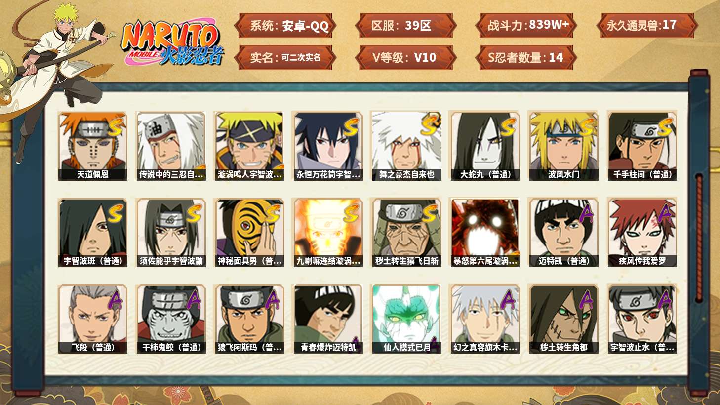 【火影忍者】【lyhy10952】战斗力:839w;段位:上忍1阶;本服排名:1298;vip:v10级;s忍:14个;a忍:40个;通灵兽:17个,s忍:天道佩恩|传说中的三忍自来也|漩涡鸣人宇智波佐助|永恒万花筒宇智波佐助|舞之豪杰自来也|大蛇丸(普通)|波风水门|千手柱间(普通)|宇智波斑(普通)|须佐能乎宇智波鼬|神秘面具男(普通)|九喇嘛连结漩涡鸣人|秽土转生猿飞日斩|暴怒第六尾漩涡鸣人__a忍:青春爆炸迈特凯|仙人模式巳月|幻之真容旗木卡卡西|秽土转生角都|宇智波止水(普通)|青年波风水门|近松十人卫千代|半蛇斗篷药师兜|须佐能乎宇智波佐助|九尾查克拉漩涡鸣人|晓大蛇丸|百豪春野樱|忍界大战秋道丁次|忍界大战我爱罗|秽土转生猿飞阿斯玛|新春限定宇智波鼬|奇拉比(普通)|万花筒写轮眼宇智波佐助|五代目水影照美冥|五代目雷影达鲁伊|死司凭血飞段|疾风传我爱罗 3星|飞段(普通) 3星|小南(普通)|万花筒写轮眼旗木卡卡西|迈特凯(普通) 4星|宇智波鼬(普通)|夏日限定宇智波鼬|干柿鬼鲛(普通) 3星|秽土转生桃地再不斩|蝎(普通)|猿飞阿斯玛(普通) 3星|桃式显现漩涡博人|六代目水影长十郎|不缘|宇智波泉奈|羁绊神农|忍界大战土台|初始形态机械鸣人|侠隐江湖大野木__通灵兽:忍犬(普通)|蓝蛇|蛤蟆吉|忍龟|镰鼬|猿魔|山椒鱼|蜃|蛤蟆仙人|鲛鲨|蛤蟆健|乌鸦(普通)|蛞蝓(普通)|蛤蟆龙|砂之守鹤|蛤蟆广|梦貘