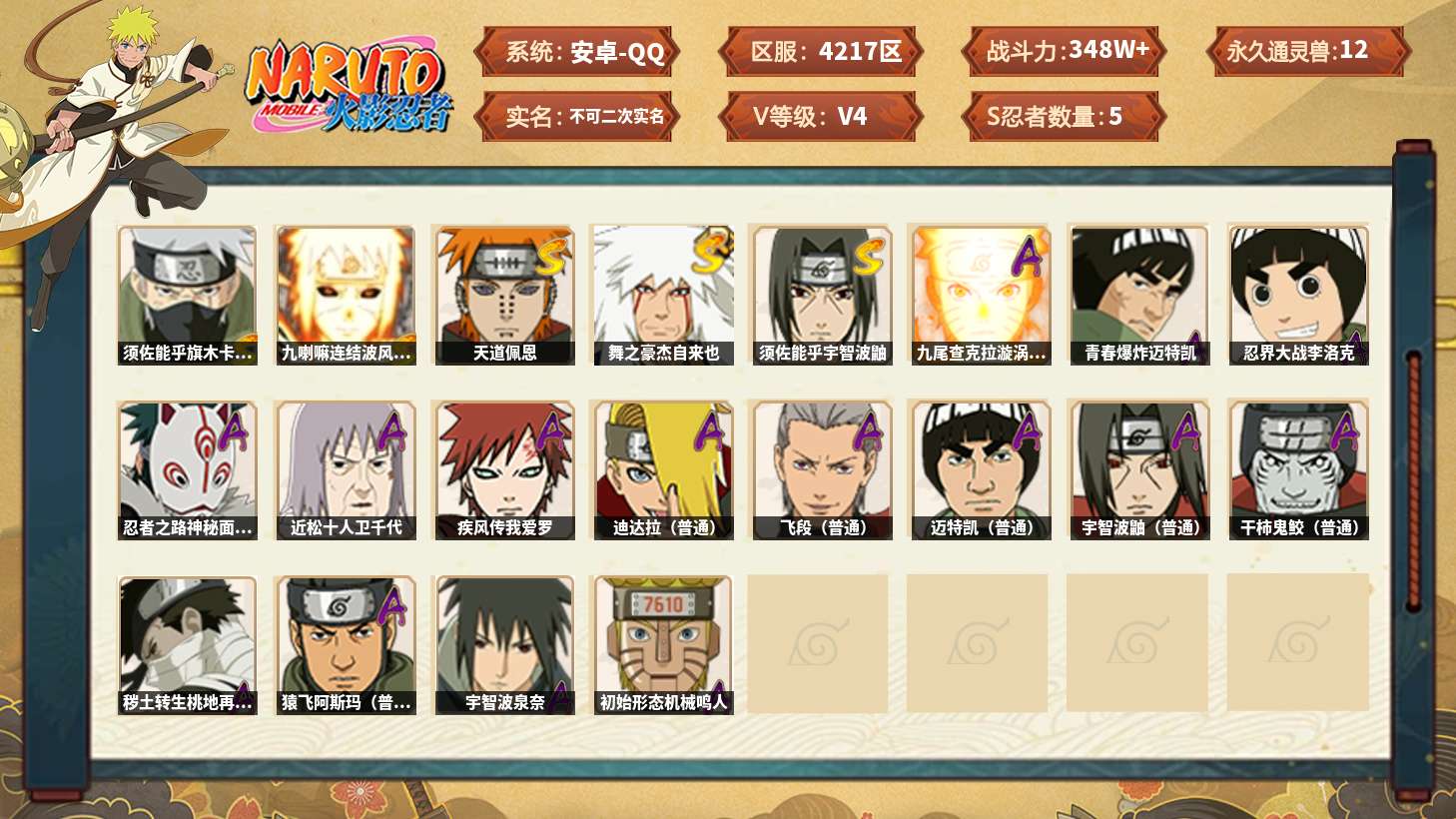 【火影忍者】【lyhy10966】战斗力:348w;段位:中忍1阶;本服排名:1052;vip:v4级;s忍:5个;a忍:15个;通灵兽:12个,s忍:须佐能乎旗木卡卡西|九喇嘛连结波风水门|天道佩恩|舞之豪杰自来也|须佐能乎宇智波鼬__a忍:青春爆炸迈特凯|忍界大战李洛克|忍者之路神秘面具男|近松十人卫千代|九尾查克拉漩涡鸣人 3星|疾风传我爱罗|迪达拉(普通)|飞段(普通)|迈特凯(普通)|宇智波鼬(普通)|干柿鬼鲛(普通)|秽土转生桃地再不斩|猿飞阿斯玛(普通)|宇智波泉奈|初始形态机械鸣人__通灵兽:忍犬(普通)|蓝蛇|蛤蟆吉|忍龟|镰鼬|猿魔|山椒鱼|蜃|蛤蟆仙人|鲛鲨|砂之守鹤|蛤蟆健