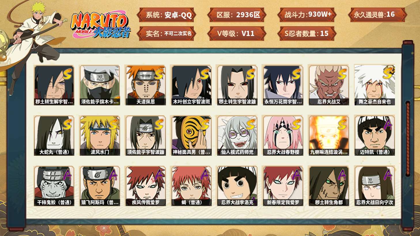 【火影忍者】【lyhy10974】战斗力:930w;段位:见习1阶;vip:v11级;s忍:15个;a忍:30个;通灵兽:16个,s忍:秽土转生解宇智波斑|须佐能乎旗木卡卡西|天道佩恩|木叶创立宇智波斑|秽土转生宇智波鼬|永恒万花筒宇智波佐助|忍界大战艾|舞之豪杰自来也|大蛇丸(普通)|波风水门|须佐能乎宇智波鼬|神秘面具男(普通)|仙人模式药师兜|忍界大战春野樱|九喇嘛连结漩涡鸣人__a忍:忍界大战李洛克|新春限定我爱罗|秽土转生角都|忍界大战日向宁次|青年长门|忍者之路神秘面具男|新春限定迪达拉|青年波风水门|青年艾|近松十人卫千代|夏日泳装照美冥|新春限定小南|忍界大战秋道丁次|新春限定宇智波鼬|万花筒写轮眼宇智波佐助|五代目水影照美冥|死司凭血飞段|疾风传我爱罗 3星|迪达拉(普通)|飞段(普通)|迈特凯(普通) 5星|宇智波鼬(普通)|干柿鬼鲛(普通) 5星|蝎(普通) 3星|绯流琥蝎|猿飞阿斯玛(普通) 5星|桃式显现漩涡博人|六代目水影长十郎|不动|宇智波泉奈__通灵兽:忍犬(普通)|蓝蛇|蛤蟆吉|砂之守鹤|忍龟|镰鼬|猿魔|山椒鱼|蛞蝓(普通)|蜃|蛤蟆仙人|鲛鲨|蛤蟆健|乌鸦(普通)|蛤蟆龙|蛤蟆广