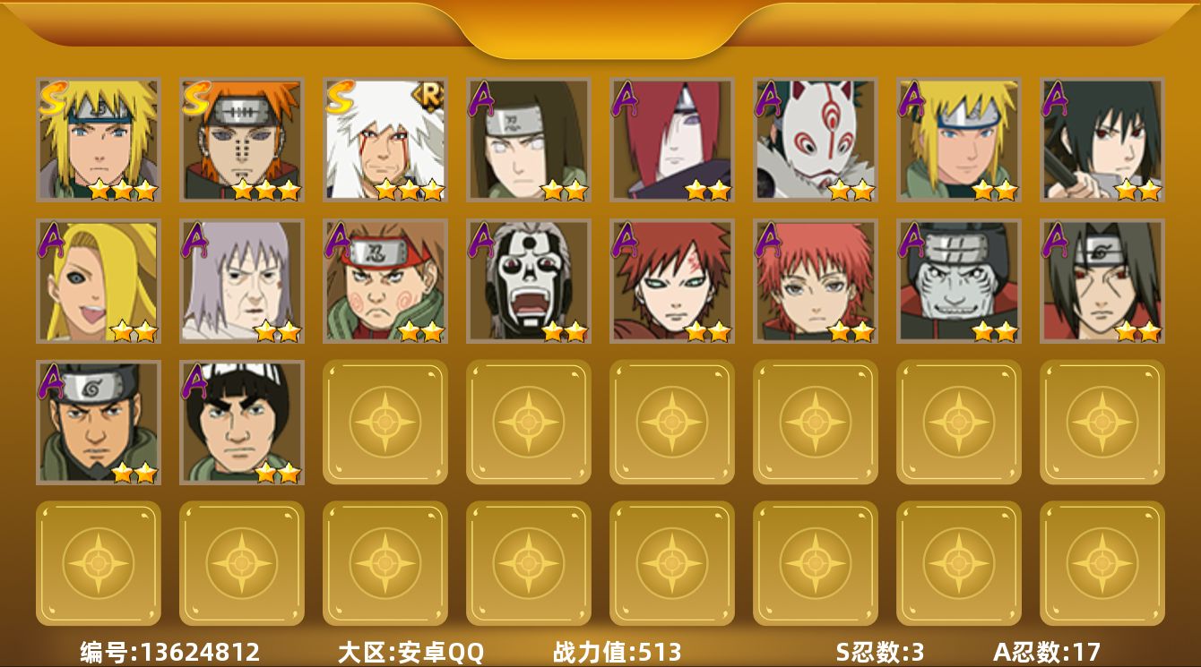 10s忍/23a忍/战力636w/v6/区服2213 【s忍者】 艾「忍界大战」,宇智波斑「秽土转生·解」,宇智波佐助「永恒万花筒」,宇智波带土「忍界大战」,自来也「舞之豪杰」,自来也「传说中的三忍」,宇智波鼬「须佐能乎」,佩恩「天道」,波风水门,大蛇丸, 【a忍者】 土台「忍界大战」,长十郎「六代目水影」,日向宁次「忍界大战」,漩涡博人「桃式显现」,旗木卡卡西「幻之真容」,宇智波泉奈,桃地再不斩