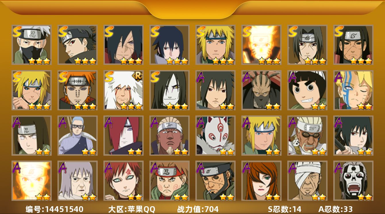 ios/14s忍/27a忍/战力866w/v7/区服389 【s忍者】 宇智波斑「秽土转生·解」,宇智波佐助「永恒万花筒」,迈特凯「死门」,自来也「舞之豪杰」,自来也「传说中的三忍」,漩涡鸣人「暴怒·第六尾」,宇智波斑「秽土转生」,长门「秽土转生」,神秘面具男,宇智波鼬「须佐能乎」,佩恩「天道」,波风水门,大蛇丸,纲手, 【a忍者】 长十郎「六代目水影」,日向宁次「忍界大战」,漩涡博人「桃式显现」