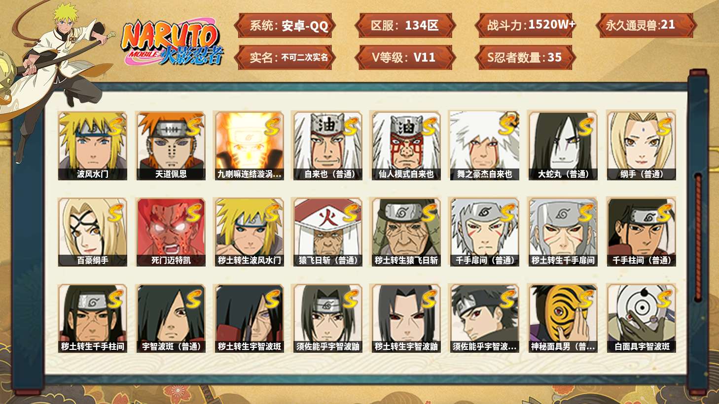 【火影忍者】【lyhy9114】战斗力:1340w;段位:上忍2阶;本服排名:28;vip:v12级;s忍:21个;a忍:38个;通灵兽:19个,s忍:纲手(普通) 4星|天道佩恩 4星|暴怒第六尾漩涡鸣人|永恒万花筒宇智波佐助|须佐能乎旗木卡卡西|舞之豪杰自来也|传说中的三忍自来也|波风水门|九喇嘛连结波风水门|猿飞日斩(普通)|秽土转生猿飞日斩|木叶创立千手柱间|秽土转生解宇智波斑|须佐能乎宇智波鼬|须佐能乎宇智波止水|白面具宇智波斑|忍界大战艾|超佩恩天道|秽土转生长门|最终章大筒木舍人|大筒木桃式__a忍:迈特凯(普通) 5星|猿飞阿斯玛(普通) 5星|干柿鬼鲛(普通) 5星|蝎(普通) 4星|疾风传我爱罗 3星|忍界大战土台 3星|宇智波鼬(普通) 3星|飞段(普通) 3星|初始形态机械鸣人|须佐能乎宇智波佐助|宇智波泉奈|百豪春野樱|忍界大战秋道丁次|忍界大战日向宁次|忍界大战李洛克|幻之真容旗木卡卡西|忍界大战旗木卡卡西|忍界大战迈特凯|青春爆炸迈特凯|宇智波止水(普通)|新春限定波风水门|近松十人卫千代|秽土转生桃地再不斩|半蛇斗篷药师兜|不缘|夏日泳装小南|漂泊浪客小南|秽土转生角都|绯流琥蝎|迪达拉(普通)|死司凭血飞段|恶灵之影飞段|漂泊浪客宇智波带土|侠隐江湖大野木|羁绊神农|六代目水影长十郎|桃式显现漩涡博人|仙人模式巳月__通灵兽:忍犬(普通)|蓝蛇|蛤蟆吉|砂之守鹤|忍龟|镰鼬|猿魔|山椒鱼|蜃|蛤蟆仙人|鲛鲨|蛤蟆健|乌鸦(普通)|蛞蝓(普通)|蛤蟆龙|辛牙|蛤蟆广|梦貘|鹰