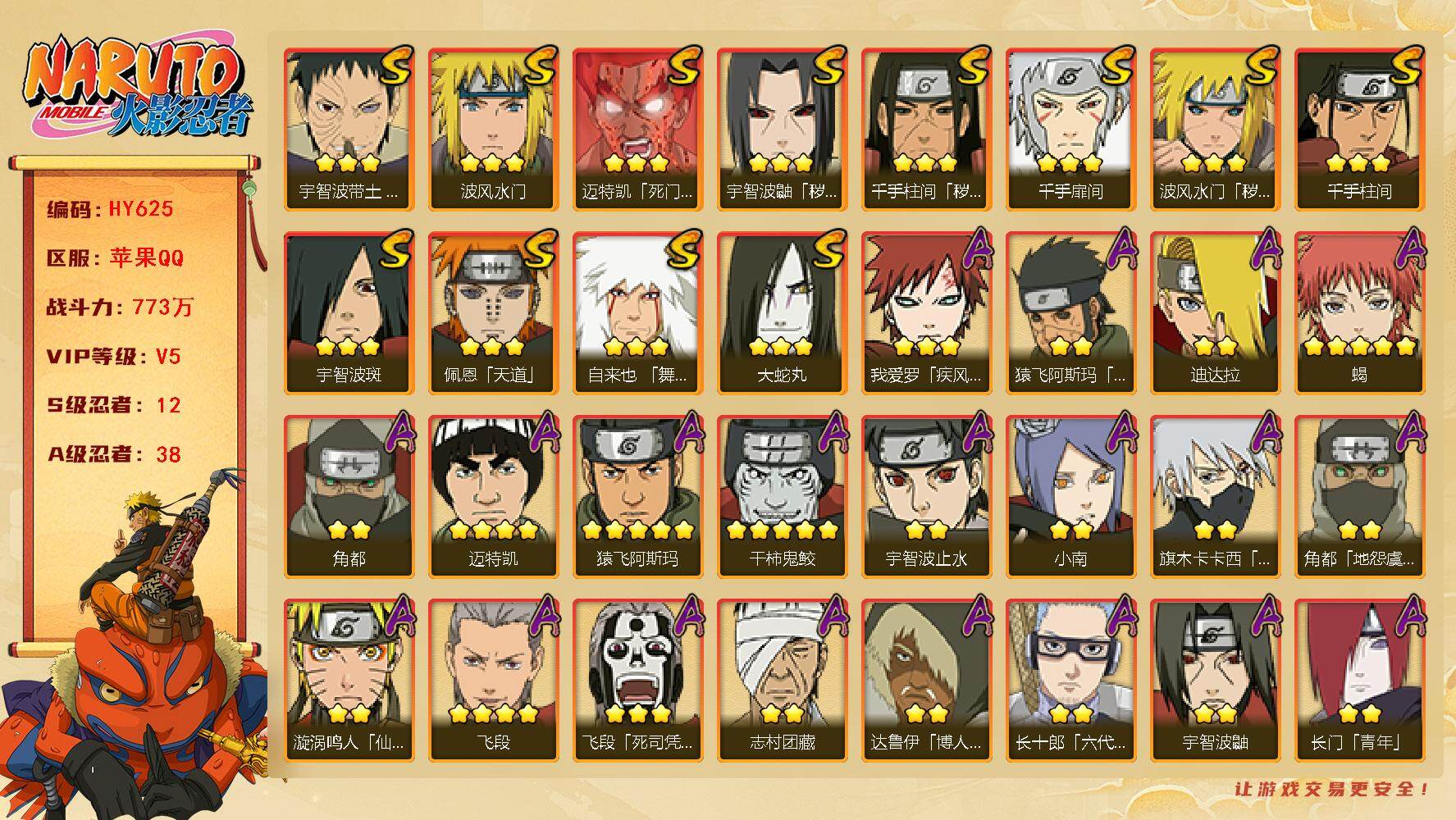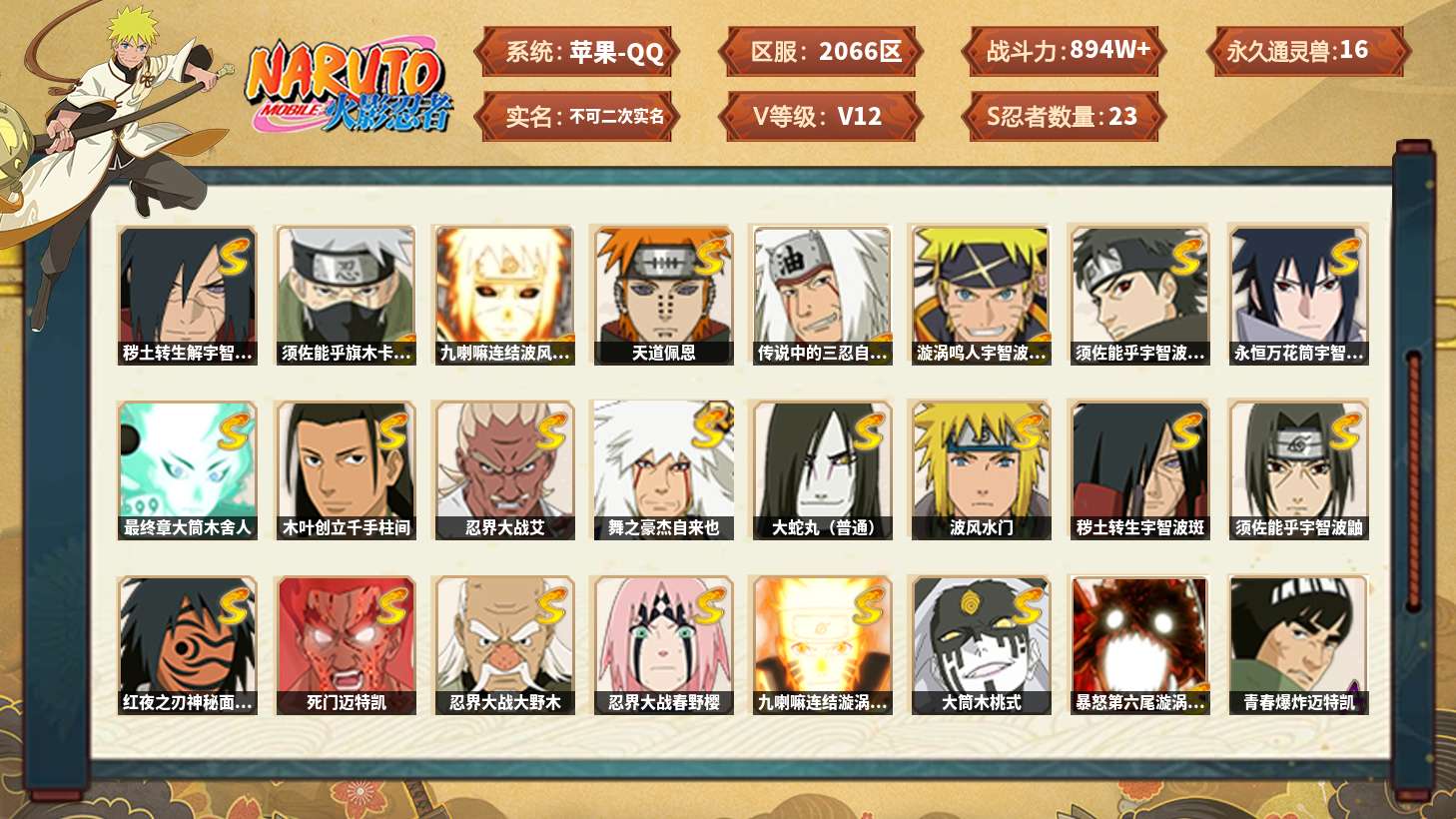 【区服】3774【等级】133【s级数量】6【a级数量】12 【s级】波风水门 自来也「舞之豪杰」 宇智波鼬「须佐能乎」 宇智波斑「秽土转生·解」 佩恩「天道」 旗木卡卡西「须佐能乎」 【a级】迈特凯 波风水门「青年」 干柿鬼鲛 日向宁次「忍界大战」 宇智波鼬「夏日限定」 漩涡博人「桃式显现」 蝎 迈特凯「青春爆炸」 我爱罗「疾风传」 宇智波佐助「须佐能乎」 飞段「死司凭血」 猿飞日斩「火影继承人