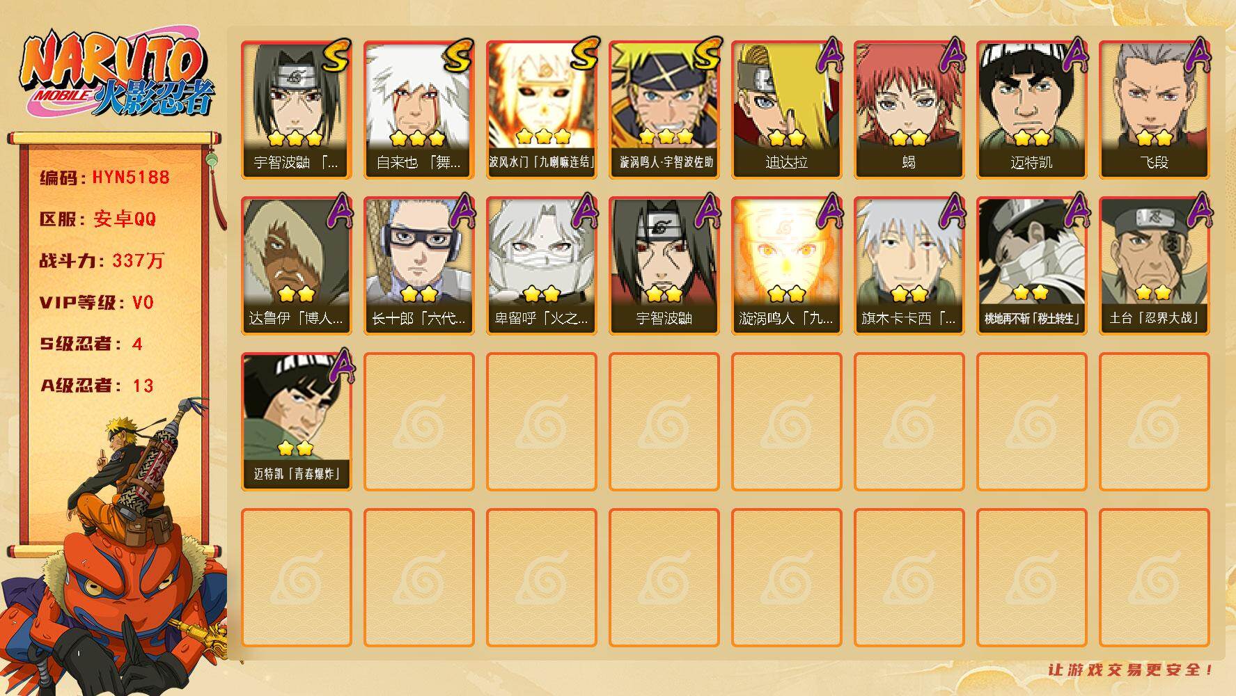 【安卓q-2511区 v8-445万战-9s 21a127忍者-15通灵】 s;旋涡鸣人 豪杰自来也 大蛇丸 死门凯 水门 须佐鼬 秽土鼬 忍战带土 佩恩 a;日向雏田 真容卡卡西 猿飞阿斯玛 旋涡博人"