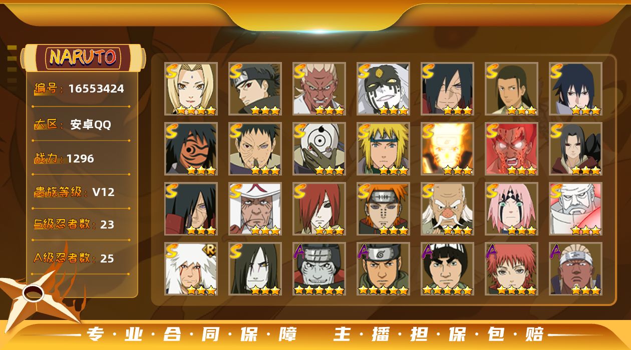 [16553424]【编号71894可秒换绑】【店长推荐捡漏号】23s级忍者数-25a级忍者数 【s级忍者】:长门「秽土转生」3星,宇智波鼬「秽土转生」3星,宇智波斑「秽土转生」3星,宇智波斑「秽土转生·解」3星,大野木「忍界大战」3星,春野樱「忍界大战」3星,宇智波带土「忍界大战」3星,艾「忍界大战」3星,宇智波止水「须佐能乎」3星,千手柱间「木叶创立」3星,自来也「舞之豪杰」3星,大蛇丸3星,纲手4星,猿飞日斩3星,波风水门3星,神秘面具男「红夜之刃」3星,漩涡鸣人「九喇嘛连结」3星,迈特凯「死门」3星,佩恩「天道」3星,宇智波佐助「永恒万花筒」3星,宇智波斑 「白面具」3星宇智波斑「白面具」,大筒木金式3星,大筒木桃式3星 【a级忍者】:艾「青年」3星,长门「青年」2星,迪达拉2星,飞段2星,飞段「死司凭血」2星,干柿鬼鲛5星,漩涡博人「桃式显现」2星,迈特凯5星,我爱罗「疾风传」3星,蝎4星,小南2星,小南「漂泊浪客」2星,猿飞阿斯玛5星,宇智波鼬2星,宇智波佐助「须佐能乎」2星,宇智波佐助「万花筒写轮眼」2星,照美冥「五代目水影」2星,日向宁次「忍界大战」2星,长十郎「六代目水影」2星,神秘面具男「忍者之路」2星,佩恩·六道「漂泊浪客」2星,李洛克「忍界大战」2星,秋道丁次「忍界大战」2星,千代「近松十人卫」2星,不缘2星