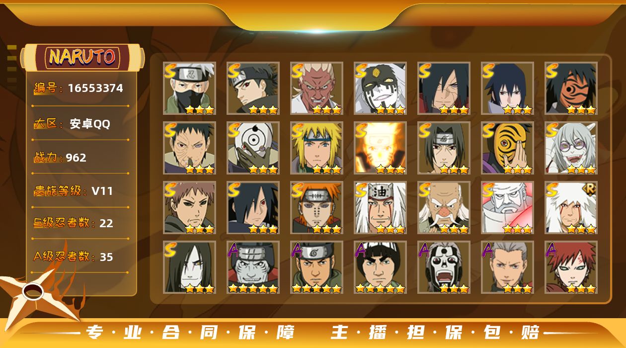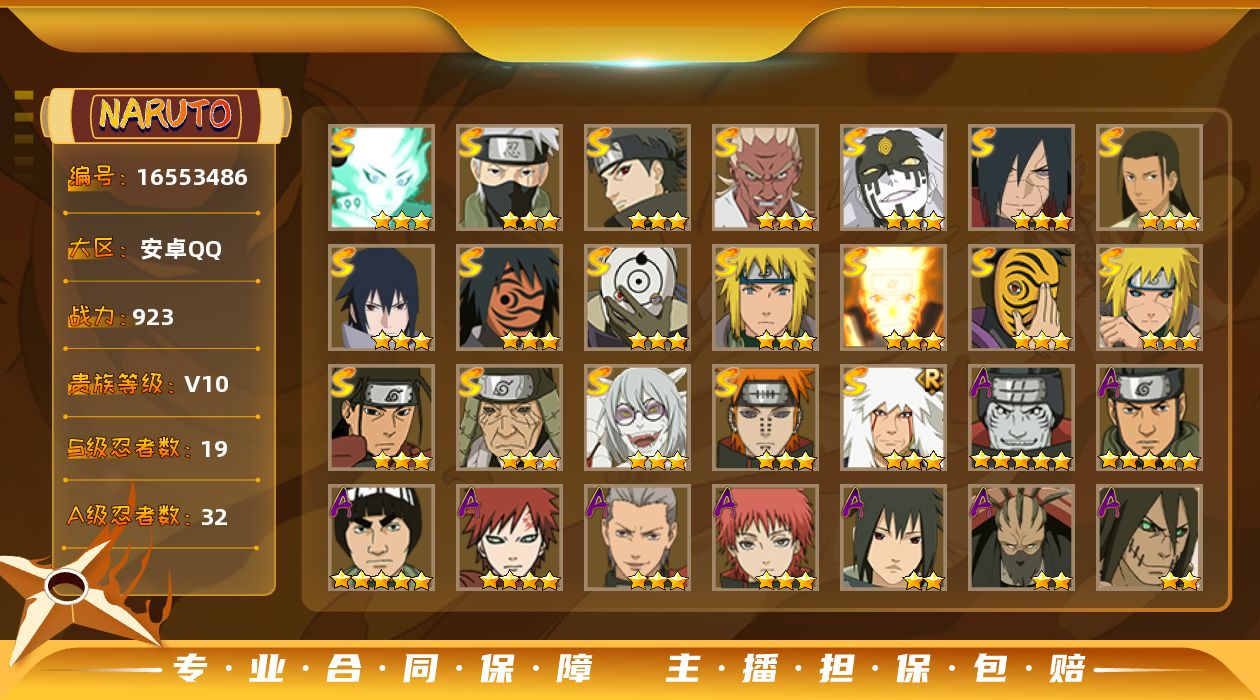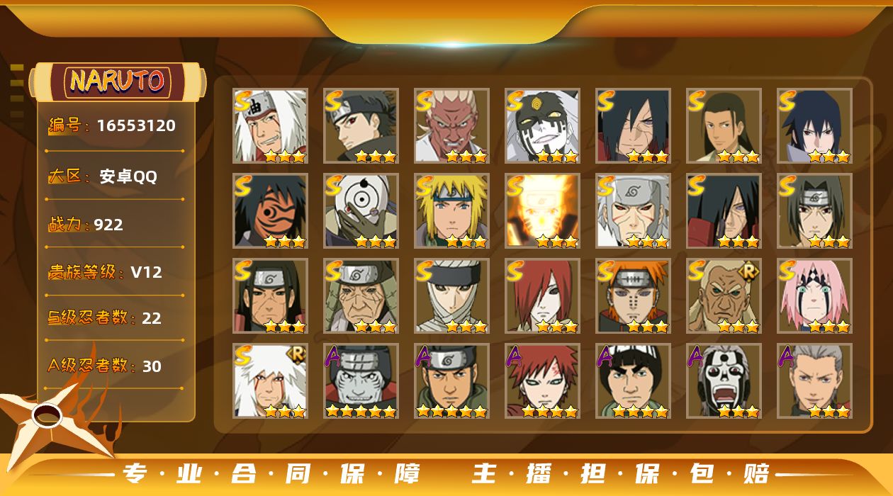 [16553374]【编号32898可秒换绑】【店长推荐捡漏号】22s级忍者数-35a级忍者数 【s级忍者】:宇智波斑「秽土转生·解」3星,大野木「忍界大战」3星,宇智波带土「忍界大战」3星,艾「忍界大战」3星,宇智波鼬「须佐能乎」3星,宇智波止水「须佐能乎」3星,旗木卡卡西「须佐能乎」3星,宇智波斑「木叶创立」3星,罗砂「四代目风影」3星,自来也3星,自来也「舞之豪杰」3星,大蛇丸3星,波风水门3星,药师兜「仙人模式」3星,神秘面具男3星,神秘面具男「红夜之刃」3星,漩涡鸣人「九喇嘛连结」3星,佩恩「天道」3星,宇智波佐助「永恒万花筒」3星,宇智波斑 「白面具」3星宇智波斑「白面具」,大筒木金式3星,大筒木桃式3星 【a级忍者】:艾「青年」2星,波风水门「青年」2星,达鲁伊「博人传」2星,迪达拉2星,迪达拉「秽土转生」2星,奇拉比2星,奇拉比「忍界大战」2星,飞段3星,飞段「死司凭血」3星,干柿鬼鲛5星,漩涡博人「桃式显现」2星,漩涡鸣人「九尾查克拉」2星,迈特凯5星,旗木卡卡西「万花筒写轮眼」2星,我爱罗「疾风传」3星,蝎3星,蝎「绯流琥」2星,小南「漂泊浪客」2星,猿飞阿斯玛5星,宇智波止水2星,宇智波鼬2星,宇智波佐助「须佐能乎」2星,宇智波佐助「万花筒写轮眼」2星,药师兜「半蛇斗篷」2星,照美冥「五代目水影」2星,日向宁次「忍界大战」2星,日向雏田「最终章」2星,长十郎「六代目水影」2星,卑留呼「火之意志继承者」2星,神秘面具男「忍者之路」2星,李洛克「忍界大战」2星,秋道丁次「忍界大战」2星,千代「近松十人卫」2星,宇智波泉奈2星,志村团藏2星
