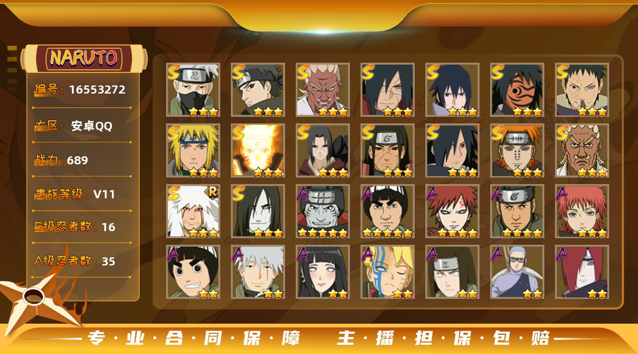 [16553272]【编号37958 可秒换绑】【店长推荐精品号】16s级忍者数-35a级忍者数 【s级忍者】:千手柱间「秽土转生」3星,宇智波鼬「秽土转生」3星,宇智波斑「秽土转生·解」3星,宇智波带土「忍界大战」3星,艾「忍界大战」3星,宇智波止水「须佐能乎」3星,旗木卡卡西「须佐能乎」3星,宇智波斑「木叶创立」3星,艾「四代目雷影」3星,自来也「舞之豪杰」3星,大蛇丸3星,波风水门3星,神秘面具男「红夜之刃」3星,漩涡鸣人「九喇嘛连结」3星,佩恩「天道」3星,宇智波佐助「永恒万花筒」3星 【a级忍者】:艾「青年」2星,长门「青年」2星,波风水门「青年」2星,达鲁伊「博人传」2星,迪达拉2星,迪达拉「秽土转生」2星,奇拉比「忍界大战」2星,飞段2星,飞段「死司凭血」2星,干柿鬼鲛5星,漩涡博人「桃式显现」2星,漩涡鸣人「九尾查克拉」2星,迈特凯5星,旗木卡卡西「幻之真容」2星,我爱罗「疾风传」4星,蝎3星,猿飞阿斯玛4星,猿飞阿斯玛「秽土转生」2星,宇智波止水「新春限定」2星,宇智波鼬2星,宇智波佐助「须佐能乎」2星,宇智波佐助「万花筒写轮眼」2星,照美冥「五代目水影」2星,日向宁次「忍界大战」2星,日向雏田「最终章」2星,宇智波带土「暴怒」2星,长十郎「六代目水影」2星,神秘面具男「忍者之路」2星,佩恩·六道「漂泊浪客」2星,李洛克「忍界大战」2星,黑土「博人传」2星,勘九郎「忍界大战」2星,秋道丁次「忍界大战」2星,千代「近松十人卫」2星,加藤断2星