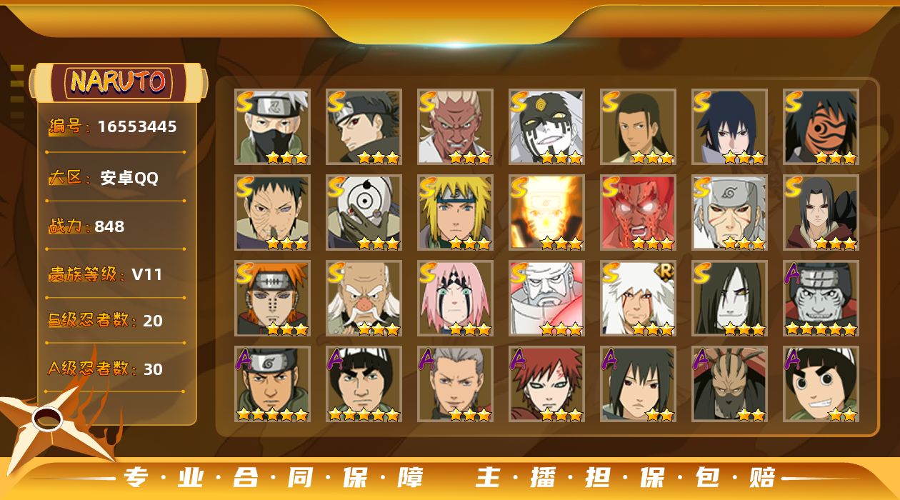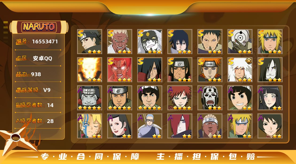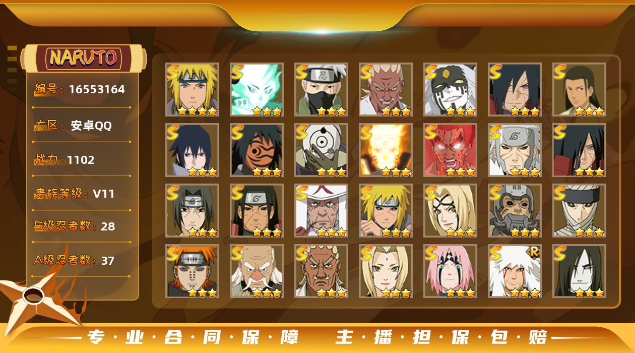 [16553164]【编号20846可秒换绑】【店长推荐捡漏号】28s级忍者数-37a级忍者数 【s级忍者】:半藏「秽土转生」3星,波风水门「秽土转生」3星,千手扉间「秽土转生」3星,千手柱间「秽土转生」3星,宇智波斑「秽土转生」3星,宇智波斑「秽土转生·解」3星,大野木「忍界大战」3星,春野樱「忍界大战」3星,艾「忍界大战」3星,宇智波鼬「须佐能乎」3星,旗木卡卡西「须佐能乎」3星,千手柱间「木叶创立」3星,无「二代目土影」3星,艾「四代目雷影」3星,自来也「舞之豪杰」3星,大蛇丸3星,纲手3星,纲手「百豪」3星,猿飞日斩3星,波风水门4星,神秘面具男「红夜之刃」3星,漩涡鸣人「九喇嘛连结」3星,迈特凯「死门」3星,佩恩「天道」3星,宇智波佐助「永恒万花筒」3星,宇智波斑 「白面具」3星宇智波斑「白面具」,大筒木桃式3星,大筒木舍人「最终章」3星 【a级忍者】:艾「青年」2星,长门「青年」2星,波风水门「青年」2星,波风水门「新春限定」2星,达鲁伊「博人传」2星,迪达拉「秽土转生」2星,大蛇丸「晓」2星,奇拉比2星,奇拉比「忍界大战」2星,飞段4星,飞段「死司凭血」3星,干柿鬼鲛5星,漩涡博人「桃式显现」2星,漩涡鸣人「仙人模式」2星,漩涡鸣人「九尾查克拉」2星,迈特凯5星,我爱罗「疾风传」4星,蝎4星,蝎「绯流琥」2星,角都「秽土转生」2星,猿飞阿斯玛5星,宇智波止水2星,宇智波鼬2星,宇智波佐助「须佐能乎」2星,宇智波佐助「万花筒写轮眼」2星,药师兜「半蛇斗篷」2星,日向宁次「忍界大战」2星,日向雏田「最终章」2星,长十郎「六代目水影」2星,神秘面具男「忍者之路」2星,李洛克「忍界大战」2星,猿飞木叶丸「博人传」2星,黑土「博人传」2星,秋道丁次「忍界大战」2星,千代「近松十人卫」2星,不缘2星,宇智波泉奈2星