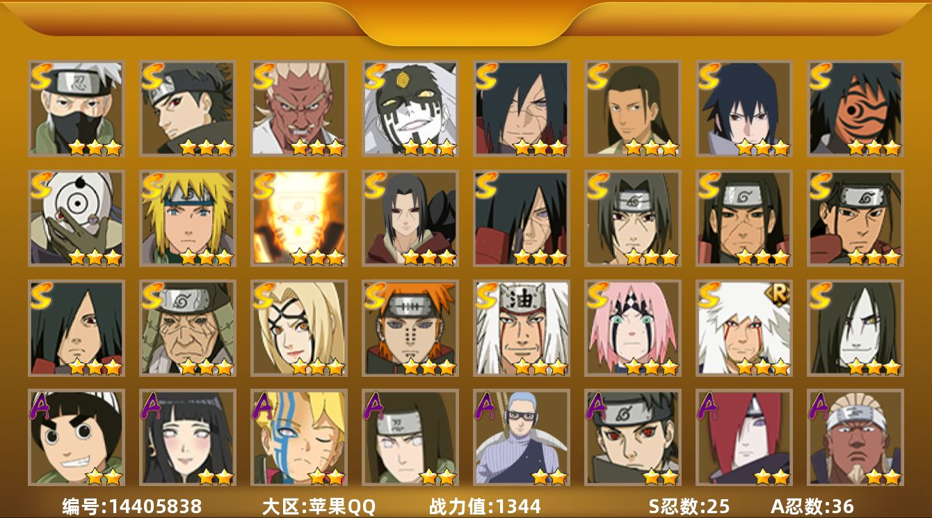 ios/16s忍/22a忍/战力1312w/v11/区服729 【s忍者】 宇智波止水「须佐能乎」,艾「忍界大战」,大筒木桃式,宇智波斑「秽土转生·解」,千手柱间「木叶创立」,自来也「舞之豪杰」,旗木卡卡西「须佐能乎」,大筒木舍人「最终章」,自来也「传说中的三忍」,千手扉间「秽土转生」,猿飞日斩「秽土转生」,宇智波鼬「须佐能乎」,佩恩「天道」,猿飞日斩,波风水门,纲手, 【a忍者】 不缘,日向宁次