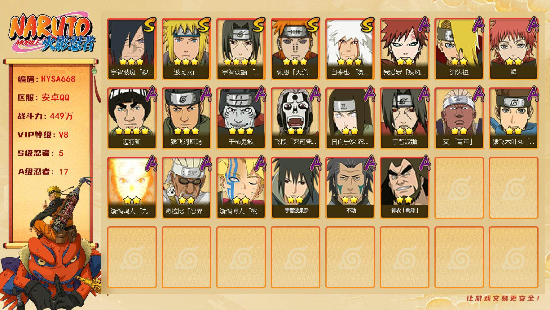 【hysa668】v8/战力449w/s忍5/a忍17/3星自来也「舞之豪杰」/4星迈特凯/2星日向宁次「忍界大战」/2星我爱罗「疾风传」/2星飞段「死司凭血」/2星宇智波鼬/2星蝎/3星佩恩「天道」/2星神农「羁绊」/4星宇智波鼬「须佐能乎」/3星波风水门/2星宇智波泉奈/2星迪达拉/2星漩涡博人「桃式显现」/3星宇智波斑「秽土转生·解」/2星艾「青年」/2星奇拉比「忍界大战」/2星漩涡鸣人「九尾查克拉」/2星不动/3星猿飞阿斯玛/3星干柿鬼鲛/2星猿飞木叶丸「博人传」