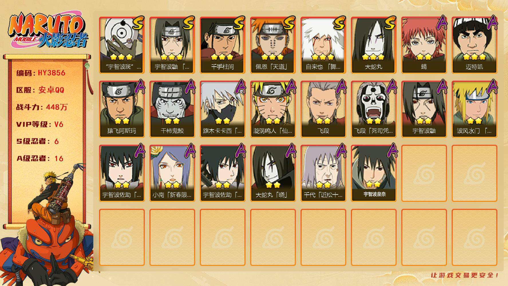【hy3856】v6/战力448w/s忍6/a忍16/3星自来也「舞之豪杰」/3星宇智波斑「白面具」/2星飞段「死司凭血」/2星宇智波鼬/3星千手柱间/2星小南「新春限定」/2星蝎/3星佩恩「天道」/2星飞段/2星漩涡鸣人「仙人模式」/2星猿飞阿斯玛/2星宇智波佐助「万花筒写轮眼」/2星宇智波泉奈/2星干柿鬼鲛/3星大蛇丸/3星迈特凯/2星旗木卡卡西「万花筒写轮眼」/2星宇智波佐助「须佐能乎」/2星千代「近松十人卫」/2星大蛇丸「晓」/3星宇智波鼬「须佐能乎」/2星波风水门「青年」